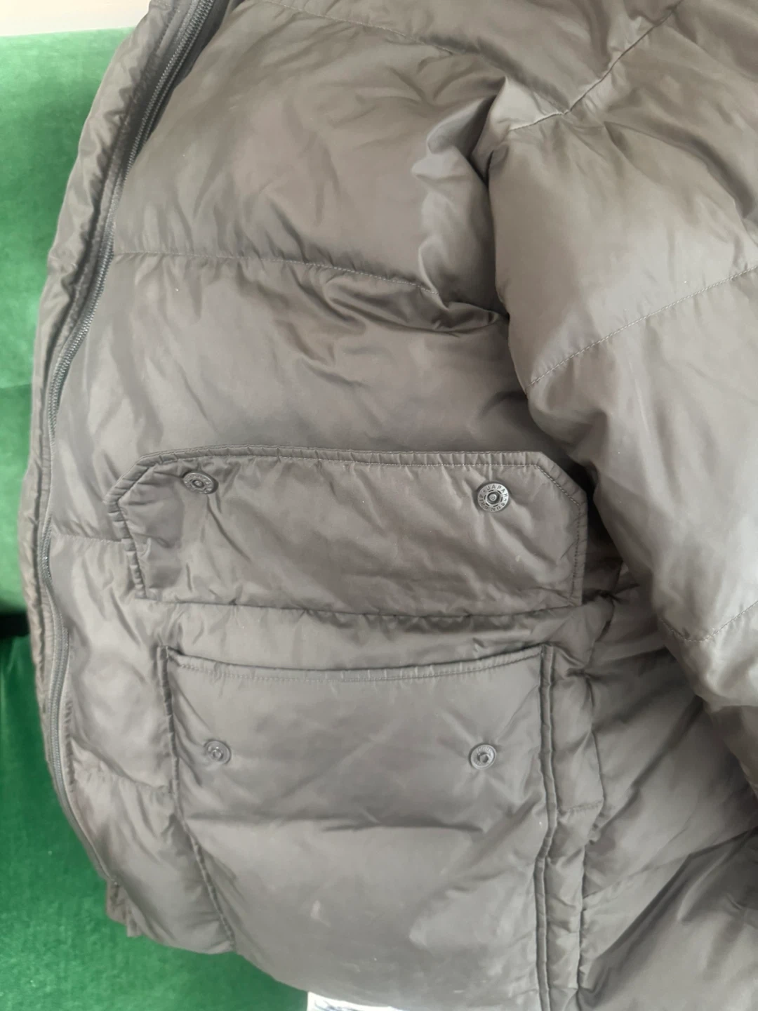 Uniqlo U collection puffer jacket in Gray color with slight olive green tone. It features a zip-up front and two front pockets with snap closures. Size S, fits oversized to M/L, It's a warm and stylish outerwear option for showing days.