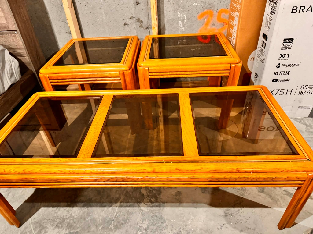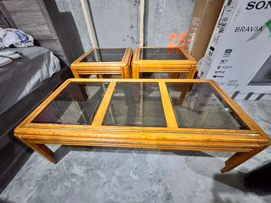 Three-piece wooden furniture set featuring a coffee table and two end tables. Each table has a glass top inset into the wood frame. The wood has a light oak finish. This set is suitable for a living room.