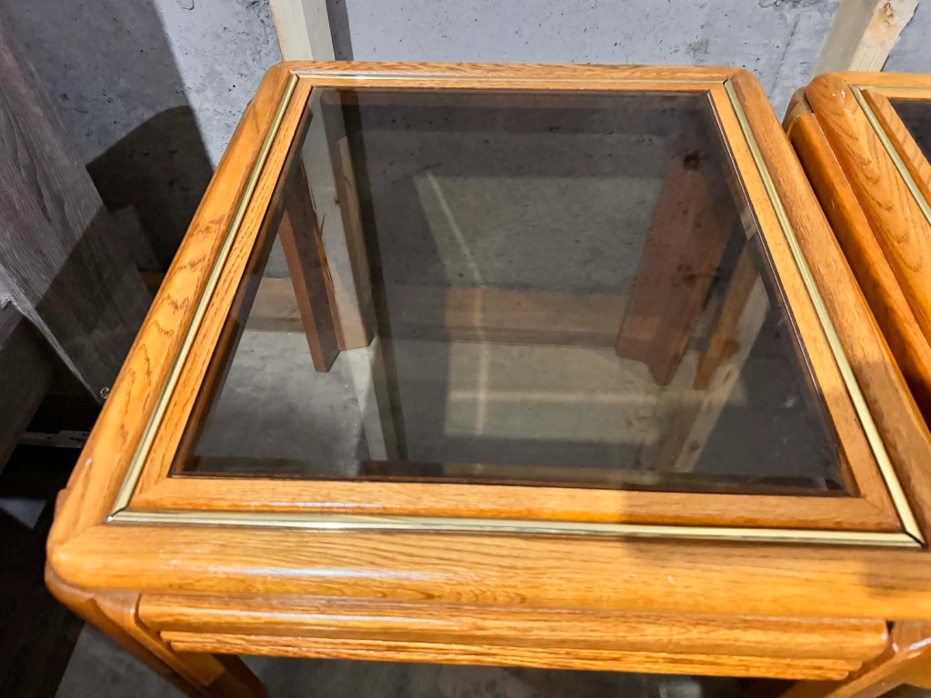Three-piece wooden furniture set featuring a coffee table and two end tables. Each table has a glass top inset into the wood frame. The wood has a light oak finish. This set is suitable for a living room.