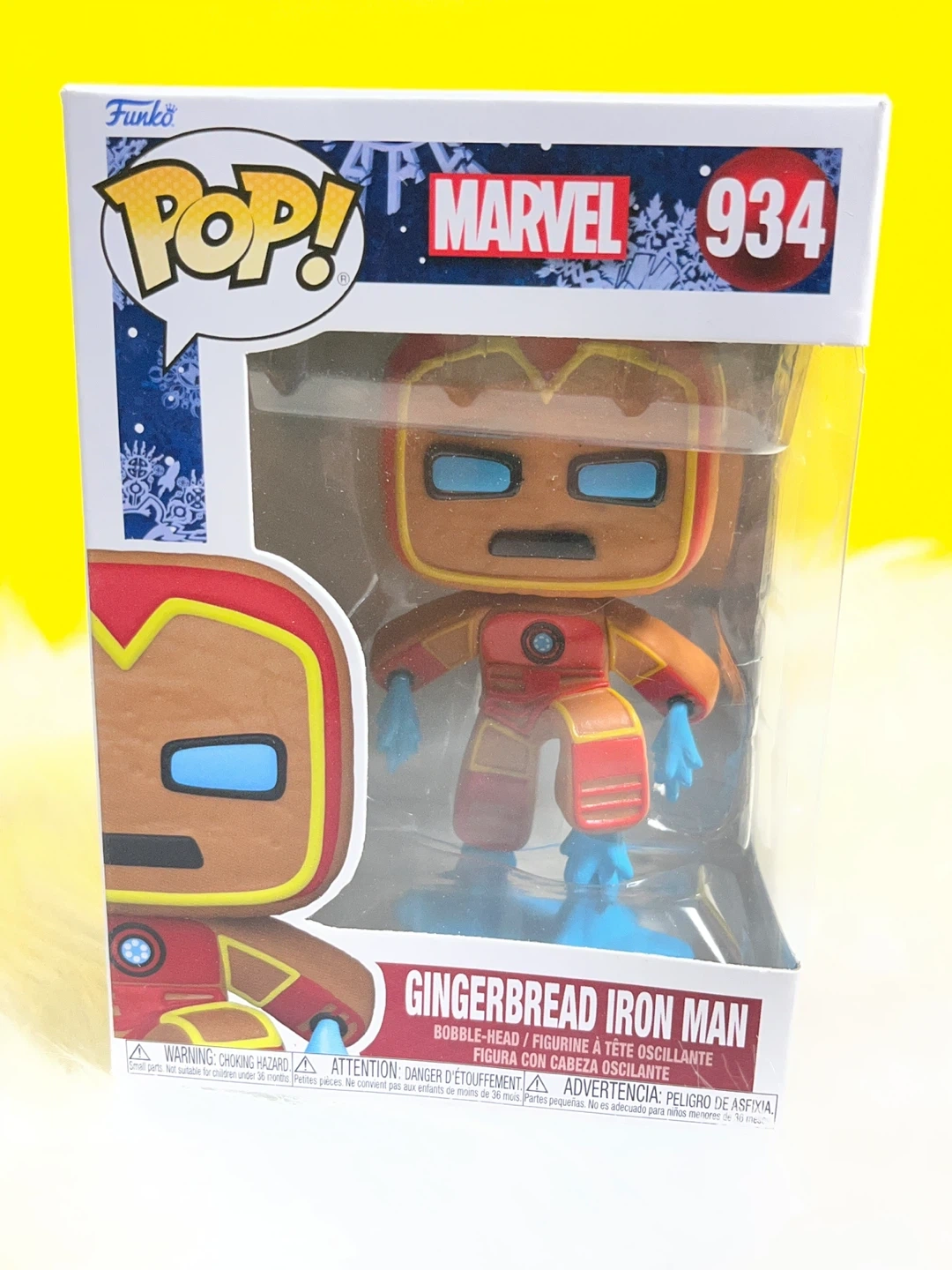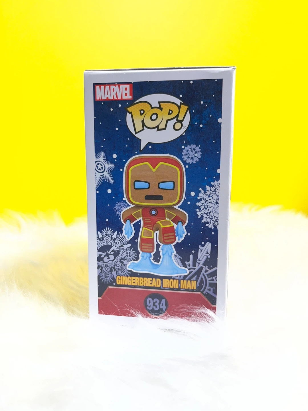 This is the Funko Pop! Marvel Gingerbread Iron Man vinyl figure, number 934 in the collection. It comes in its original box. This collectible is perfect for Marvel fans looking to add a unique holiday-themed piece to their display.