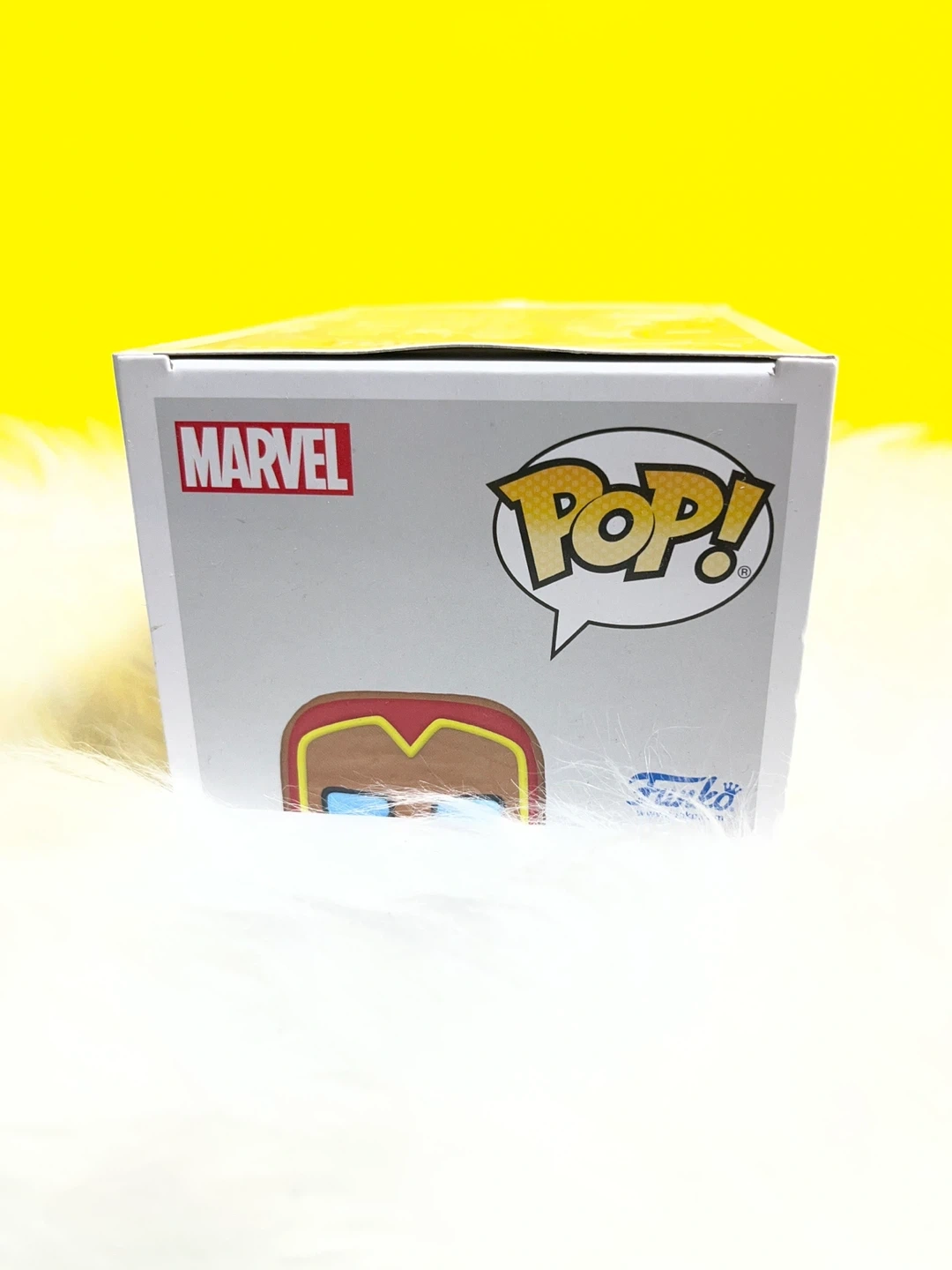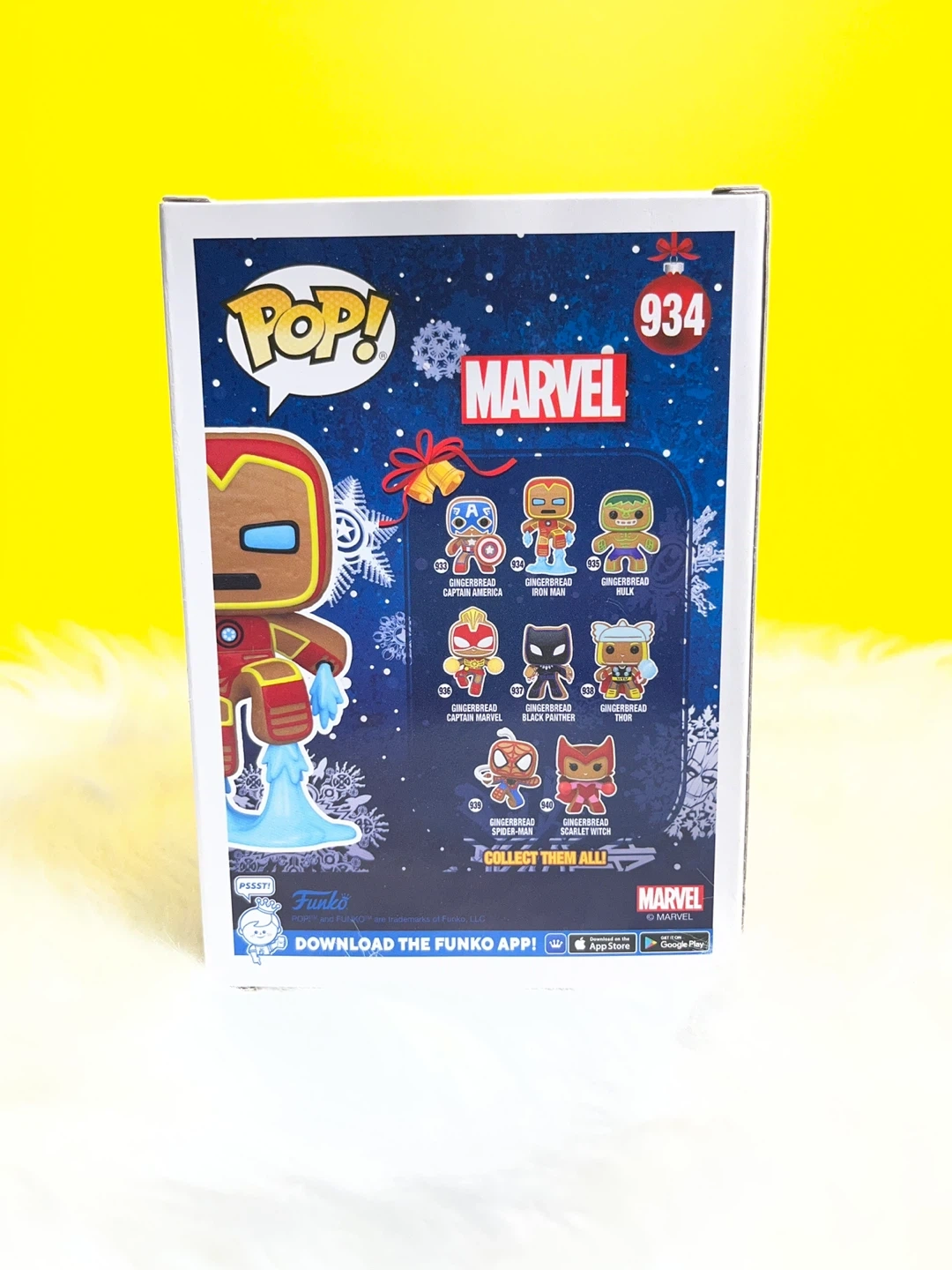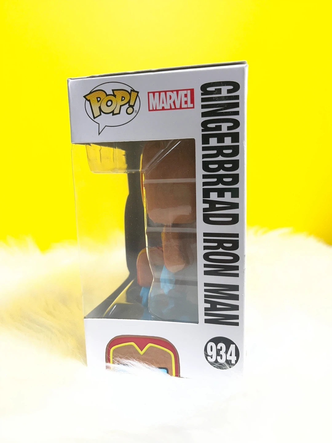This is the Funko Pop! Marvel Gingerbread Iron Man vinyl figure, number 934 in the collection. It comes in its original box. This collectible is perfect for Marvel fans looking to add a unique holiday-themed piece to their display.