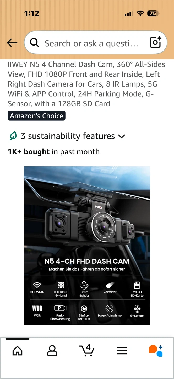 This is the IIWEY N5 4-channel dash cam. It offers a 360° all-sides view with FHD 1080P front and rear recording. Features include 5G WiFi, app control, and 24H parking mode. It also has a G-sensor and 8 IR lamps for enhanced night vision.