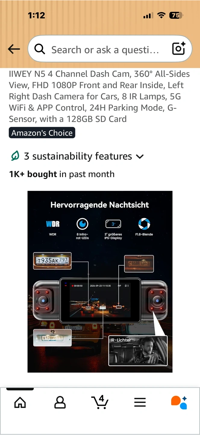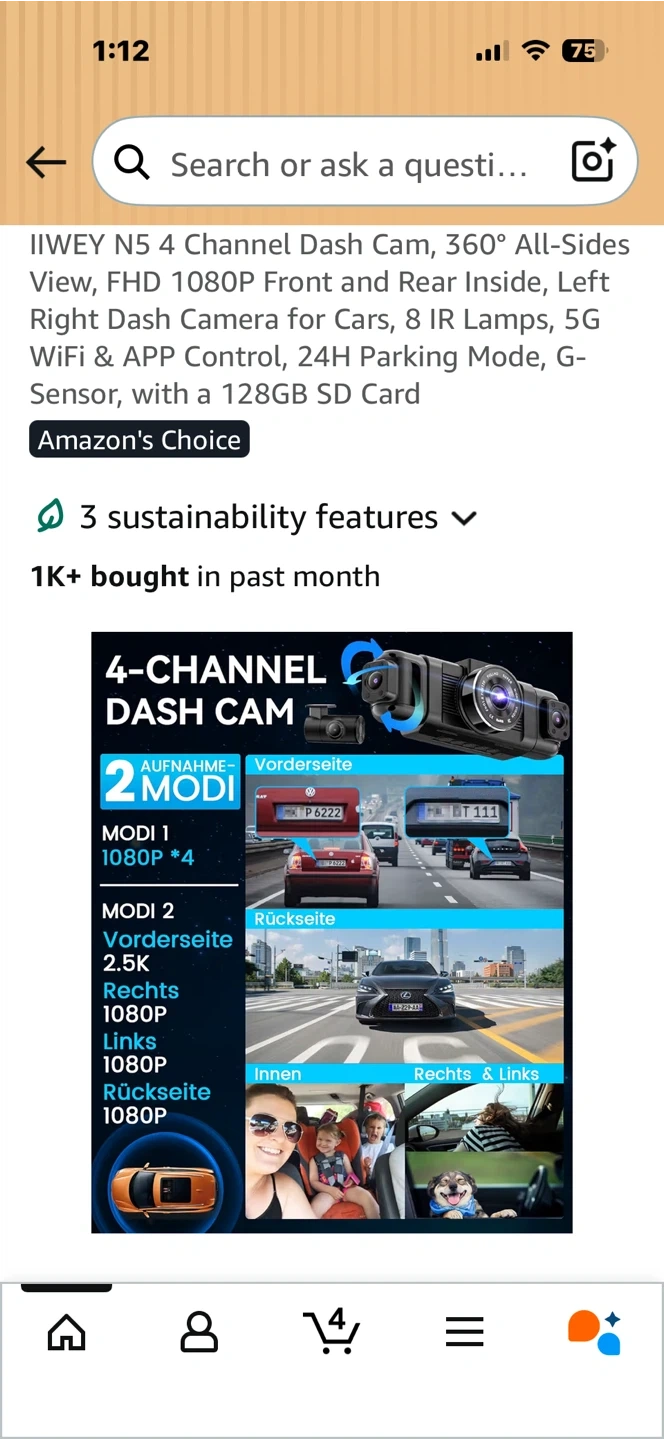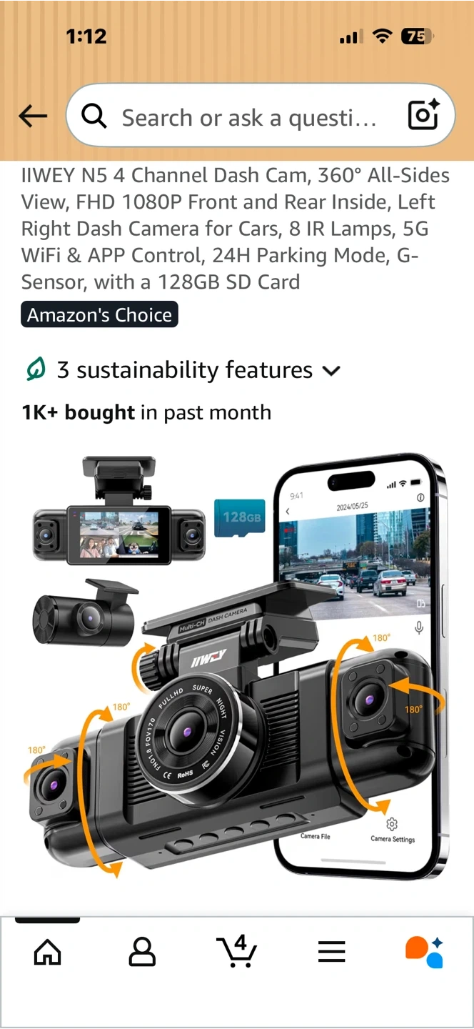 This is the IIWEY N5 4-channel dash cam. It offers a 360° all-sides view with FHD 1080P front and rear recording. Features include 5G WiFi, app control, and 24H parking mode. It also has a G-sensor and 8 IR lamps for enhanced night vision.