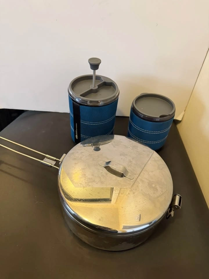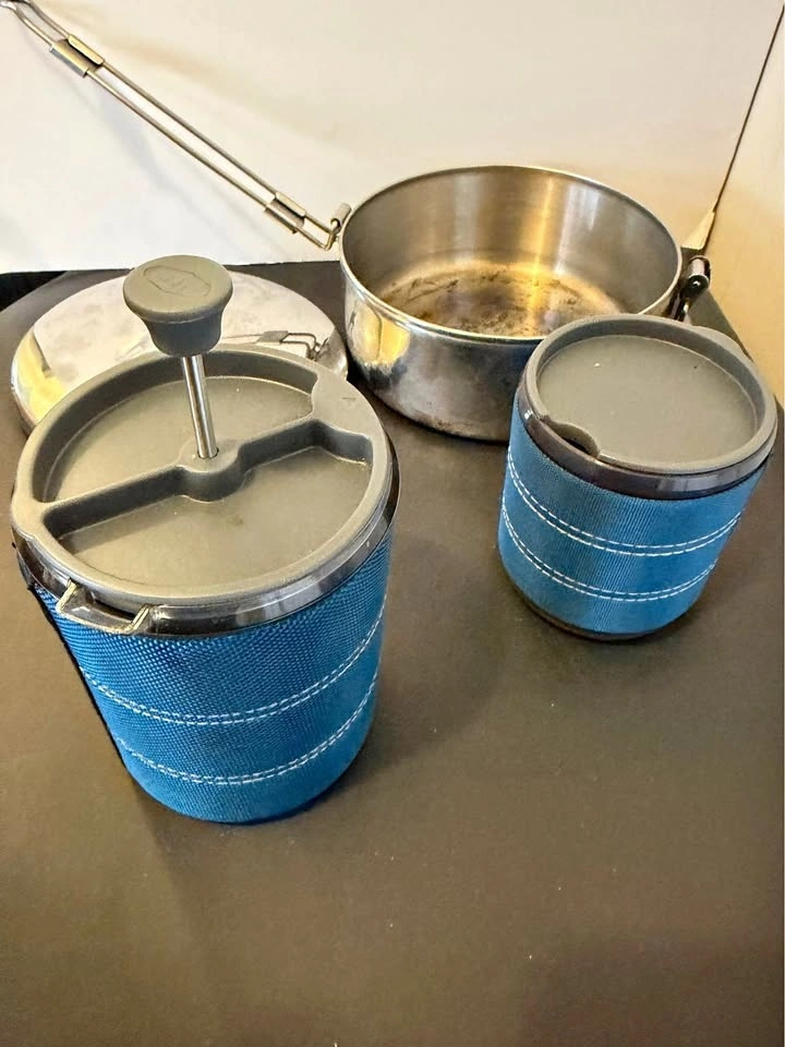 Great camping cookware set with portable stove. Includes MSR Alpine StowAway pot (1.6 L), GSI French press and mug (20 & 17 Oz), and Primus ETA pot set (1.5 L, boils water in two minutes) with a carrying bag. All in excellent condition, used in two solo camping trips. Local pickup near Steeles and Dufferin. Cash only.