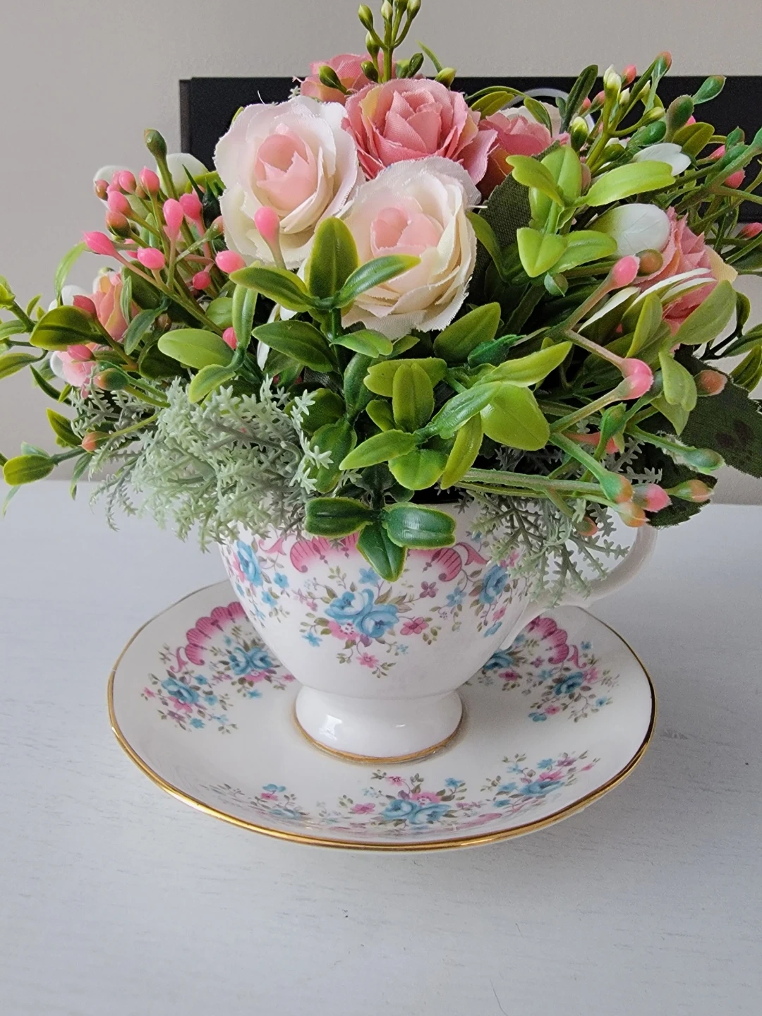 Lovely artificial flower arrangement featuring pink and white roses nestled in a vintage-style teacup and saucer. The delicate floral pattern adds a charming touch to any room. This floral display requires no watering or maintenance, making it a perfect decorative piece for homes or offices.
