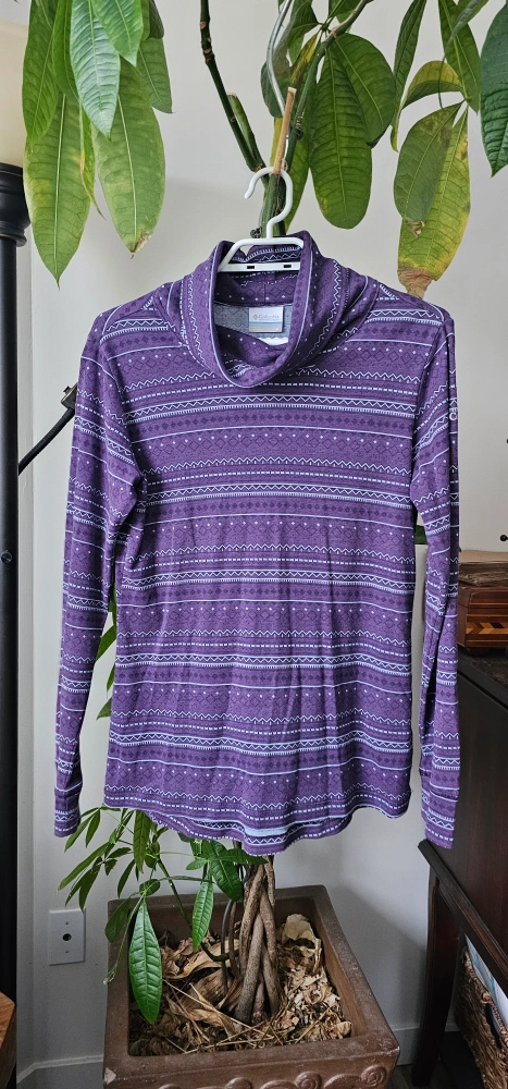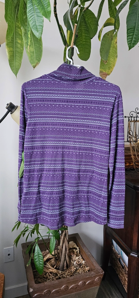 Women's long-sleeved shirt. Size medium. Purple with a patterned design. Mock neck.