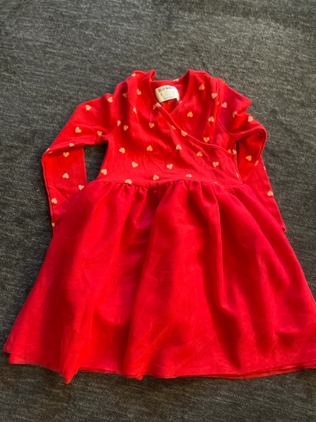 Adorable red dress. Features a subtle heart pattern. Long sleeves. Size 4T. Great for special occasions.