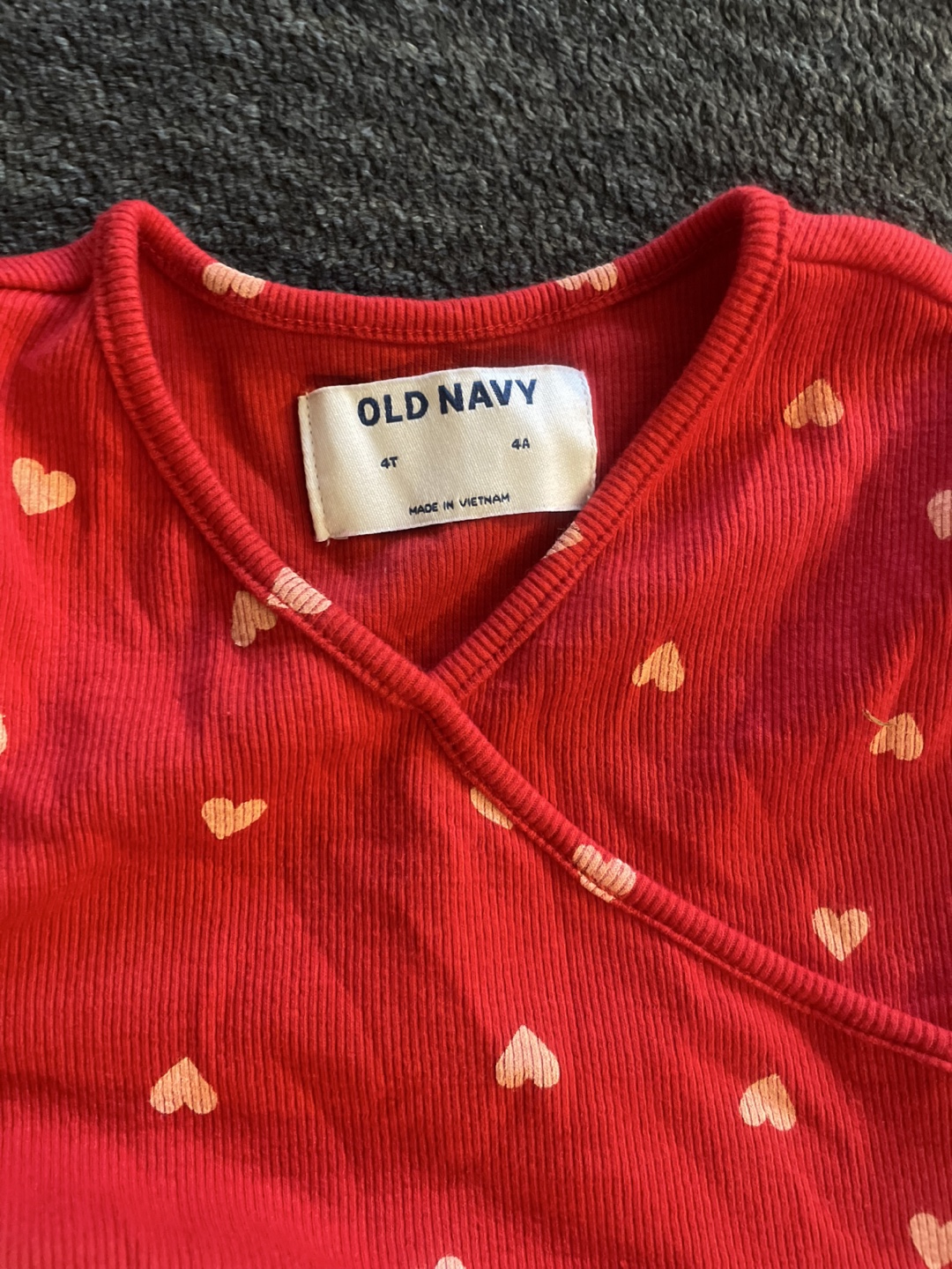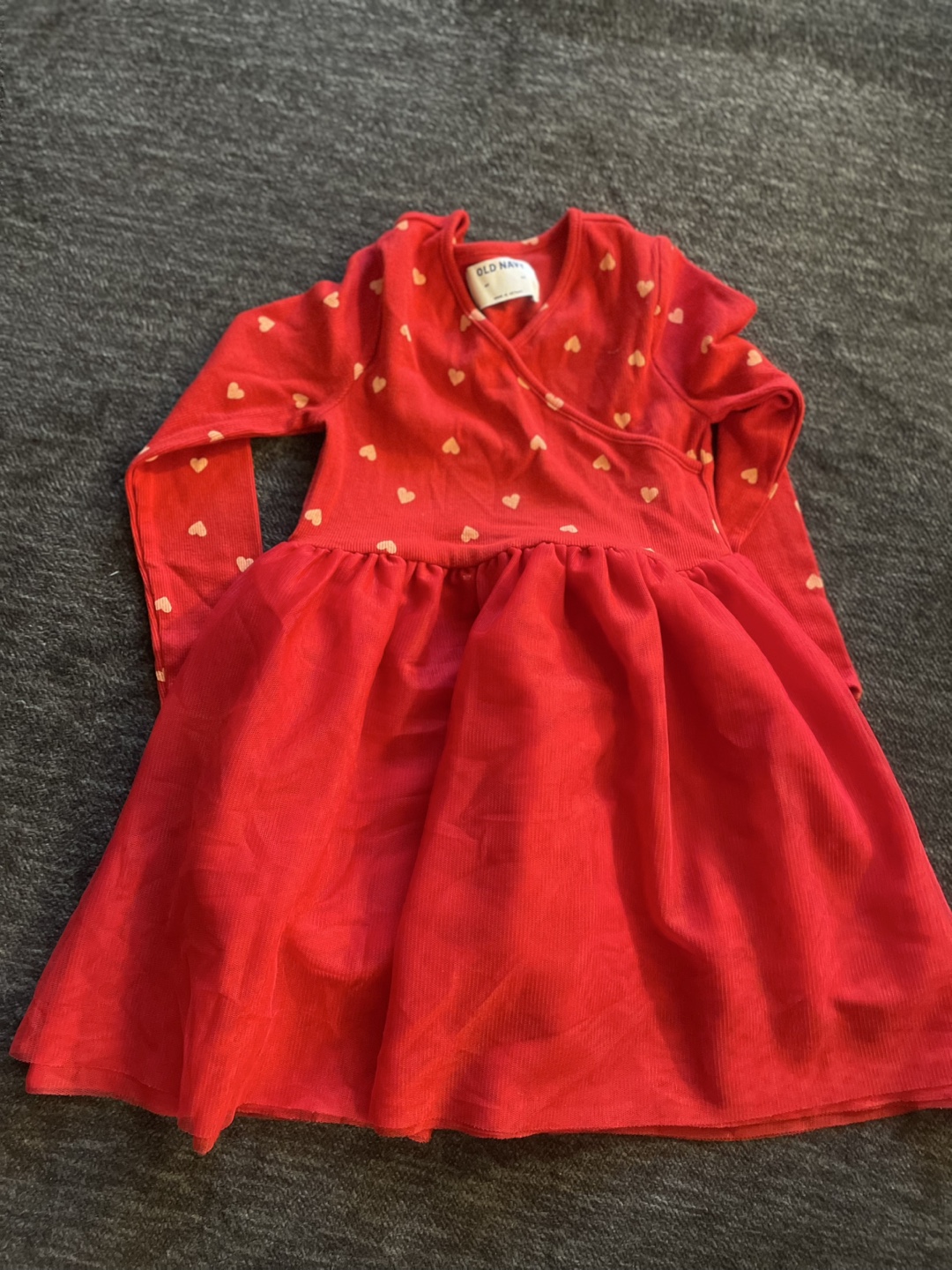 Adorable red dress. Features a subtle heart pattern. Long sleeves. Size 4T. Great for special occasions.