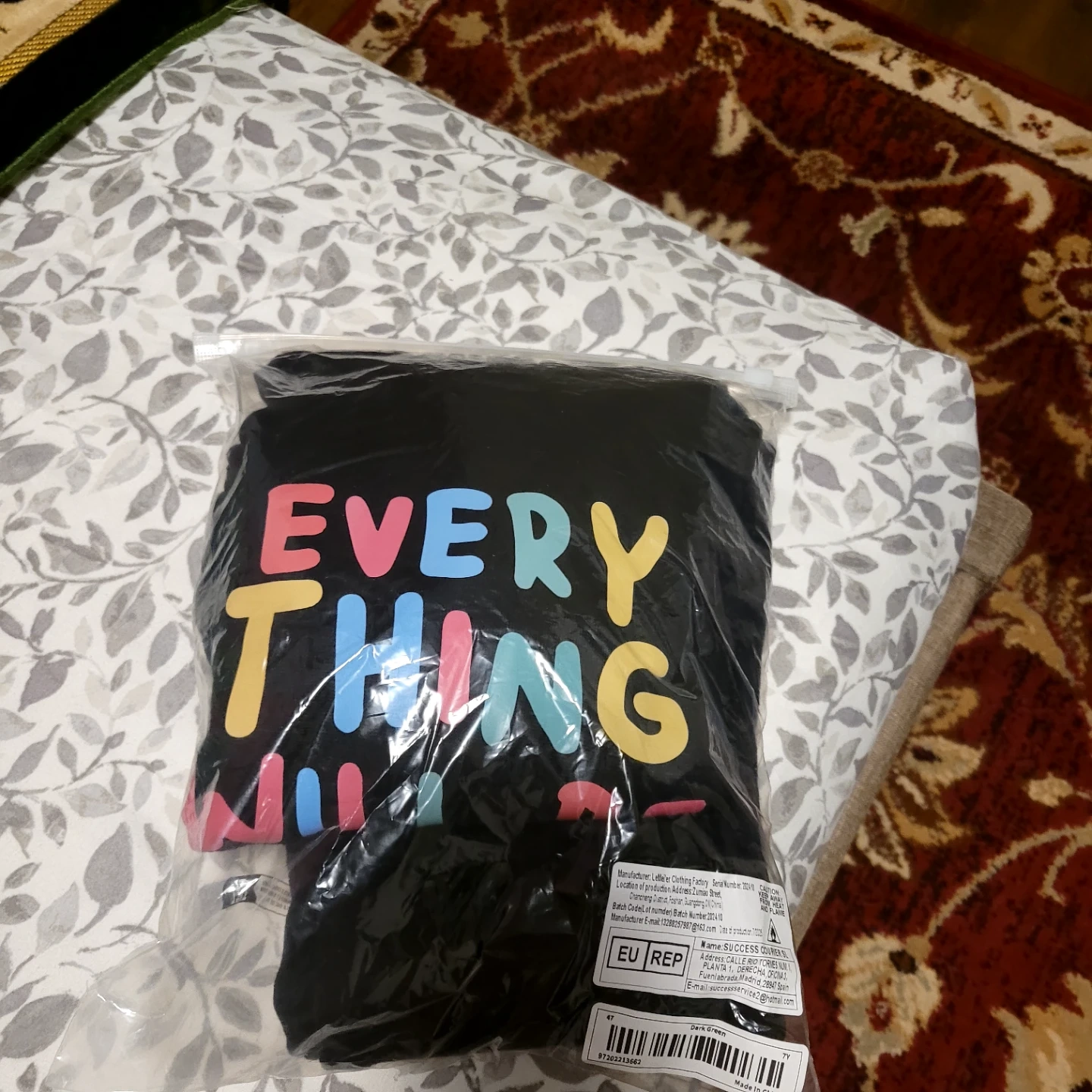 Selling a brand new t-shirt and pant set with the fun slogan "Everything Will Be Okay" printed on it! The shirt is black and still in its original packaging. It's manufactured by Leller'er Clothing Factory.