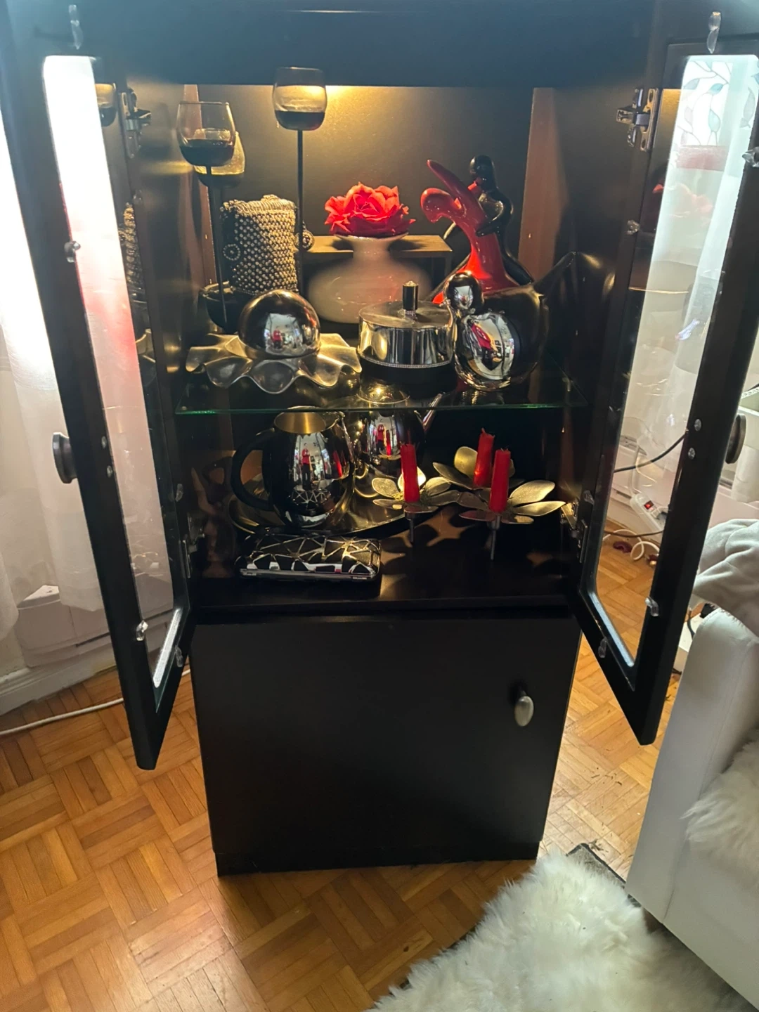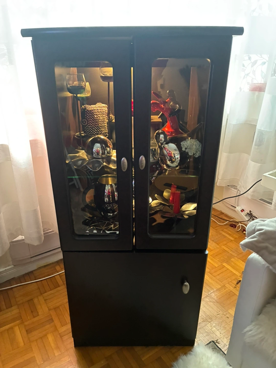 This tall display cabinet features glass doors with interior lighting. It has two shelves for displaying items and a storage cabinet at the bottom. Perfect for showcasing collectibles or decor!