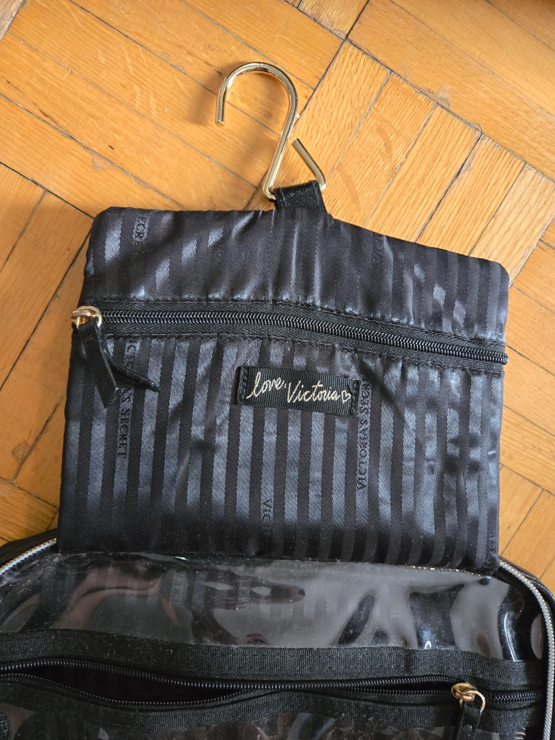 Three black Victoria's Secret travel bags. One features a pink laser-cut design. Another has a hanging hook and multiple compartments. The third is solid black with a top handle.