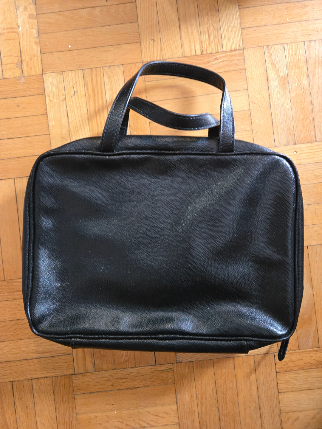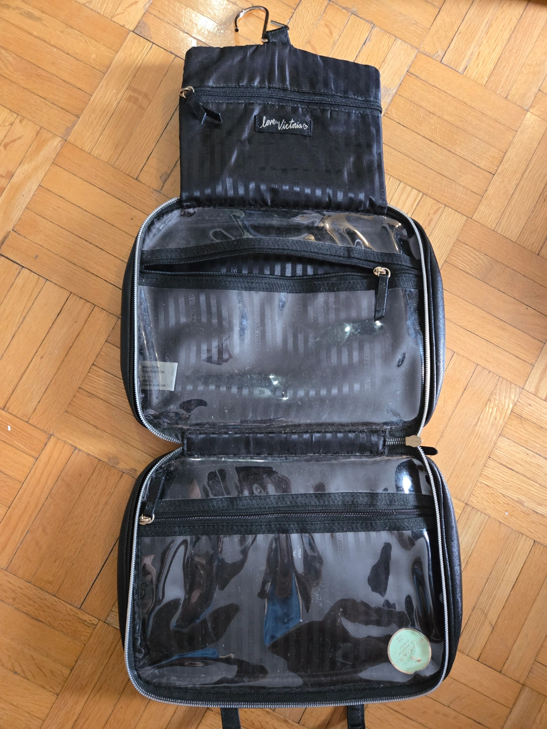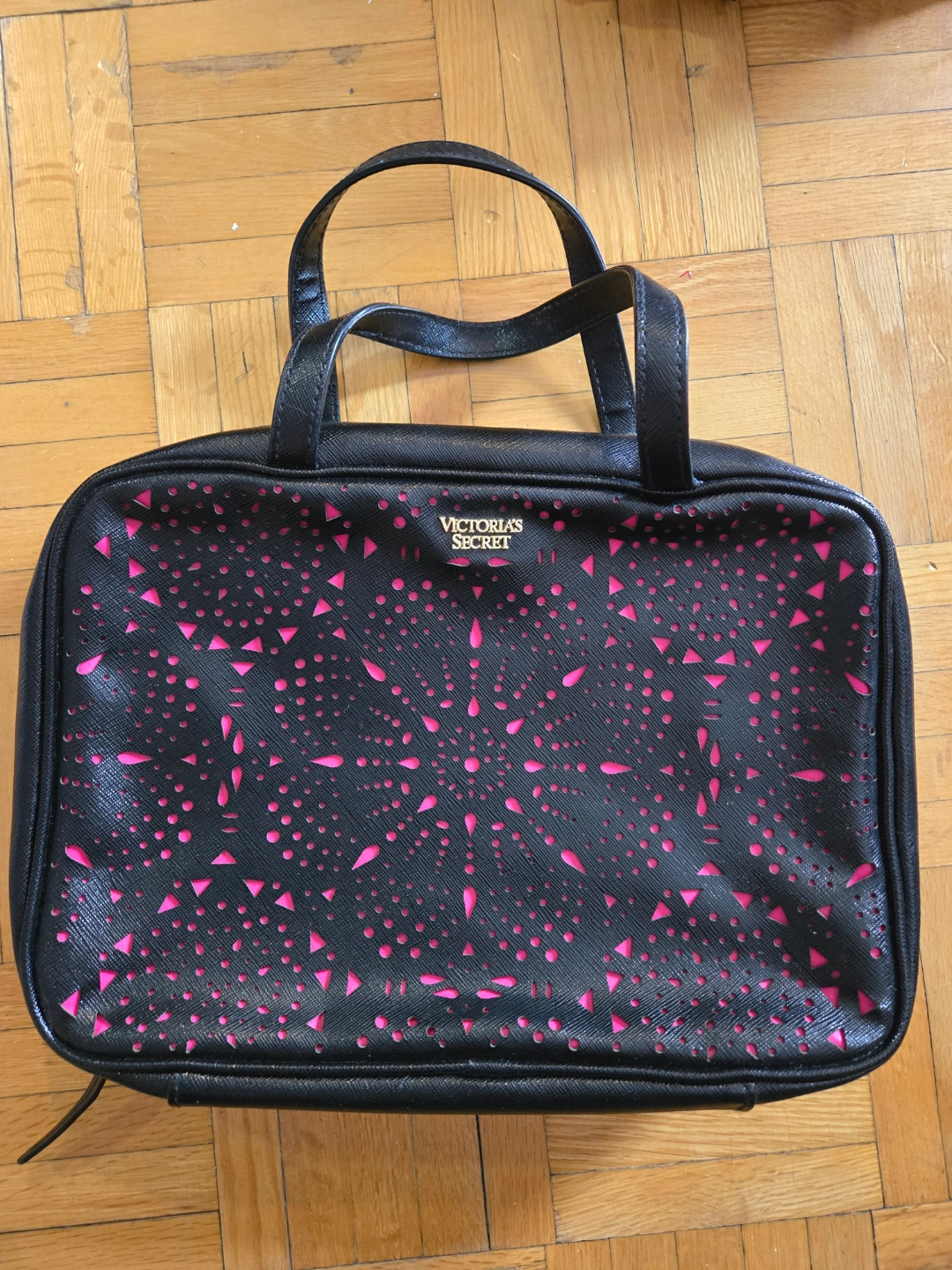 Three black Victoria's Secret travel bags. One features a pink laser-cut design. Another has a hanging hook and multiple compartments. The third is solid black with a top handle.