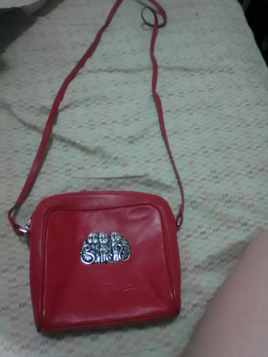 This is a cherry red leather crossbody bag. It features a silver cat embellishment It has a long strap and a compact design.