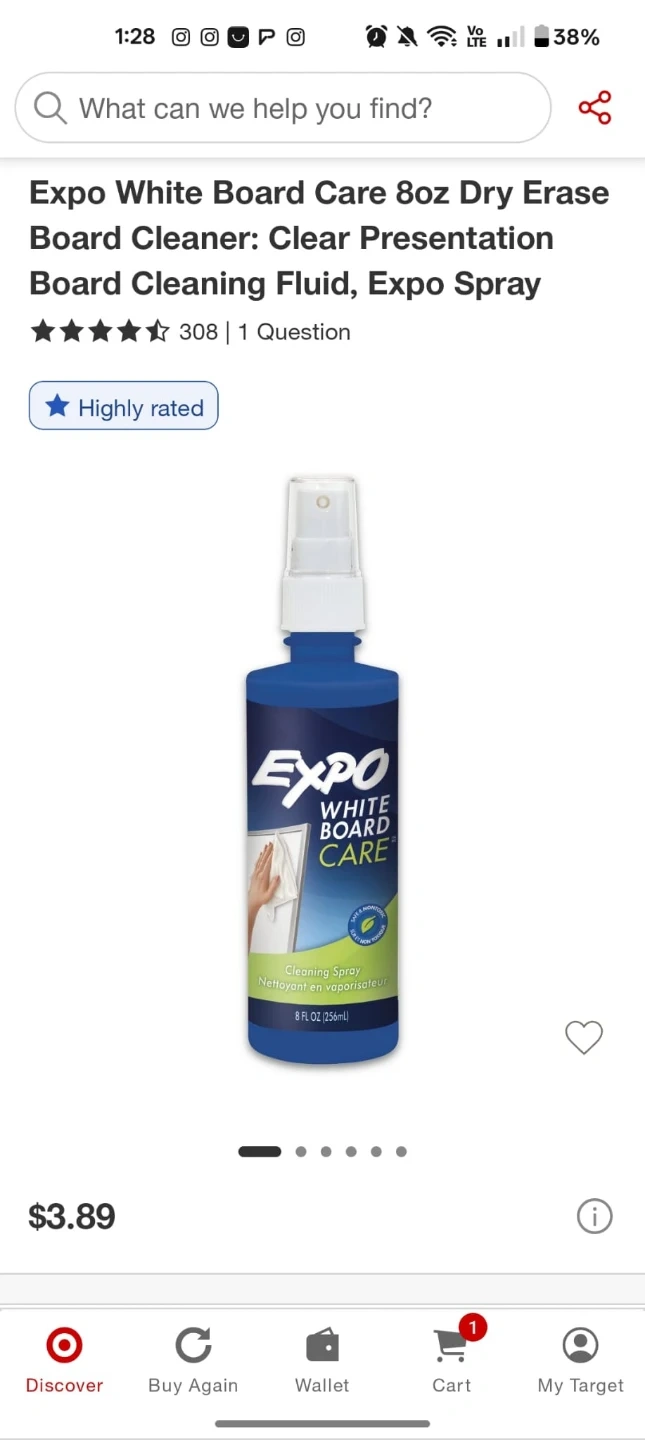 This is Expo White Board Care, an 8 oz spray bottle of dry erase board cleaner. It's a clear cleaning fluid. Great for keeping whiteboards streak-free and ready for use!