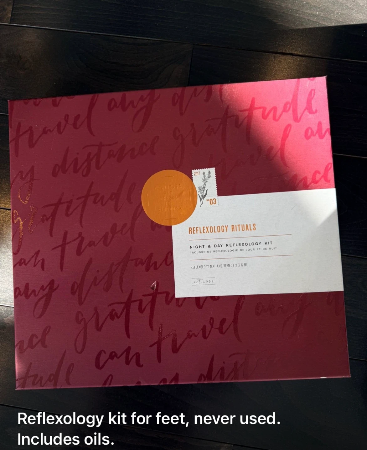 This Reflexology Rituals kit includes a reflexology mat and 2x6ml of remedy. It's never been used and is ready for a new home! Use this kit for a relaxing foot experience.
