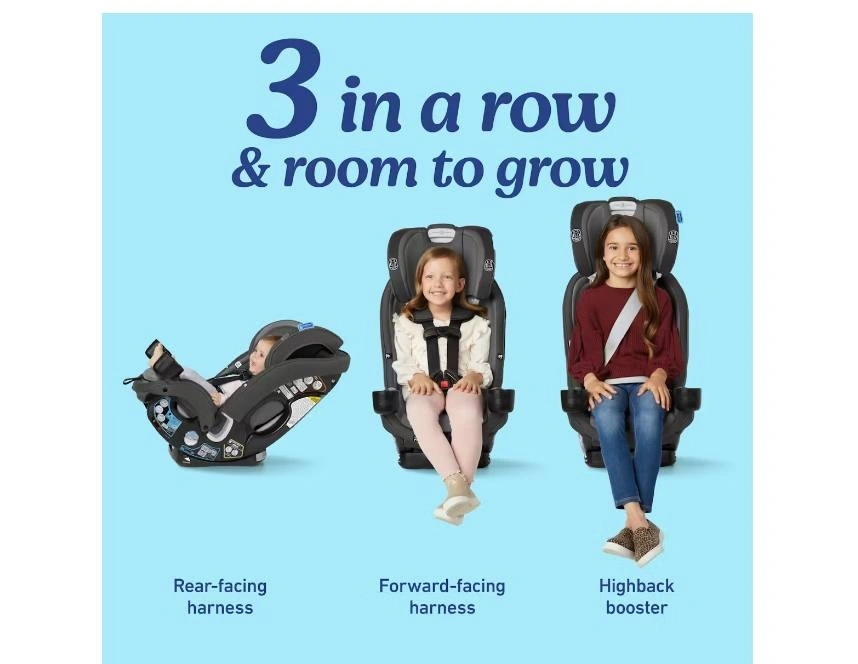 The Graco SlimFit3 LX 3-in-1 Car Seat is our slimmest design that fits 3 car seats across, saving space in your back seat without compromising on safety. This narrow all-in-one car seat grows with your child from rear-facing harness (5-40 lb) to forward-facing harness (26.5-65 lb) to highback booster (40-100 lb). Integrated belt lock-off makes for easy vehicle seat belt installation in forward-facing mode. Graco’s exclusive push-button InRight LATCH provides an easy, one-second attachment with an audible click to help ensure secure installation. The No-Rethread Simply Safe Adjust Harness System allows you to adjust the height of the headrest and harness to 10 positions with just one motion. Easily adjust the 4-position recline for a better installation and a comfortable ride. The Rapid Remove cover comes off in 60 seconds and is machine washable. Breathable mesh AirFlow channels provide improved ventilation. Two cup holders are designed to work with the three-across configuration. Fuss-free harness storage pockets conveniently hold the harness out of the way. Removable, plush head and body inserts help to keep your infant feeling cradled and comfortable. The steel-reinforced frame provides strength and durability, and EPS energy-absorbing foam provides effective impact energy management. This car seat is Graco ProtectPlus Engineered to help protect in frontal, side, rear, and rollover crashes. Feel free to message if you have any questions!