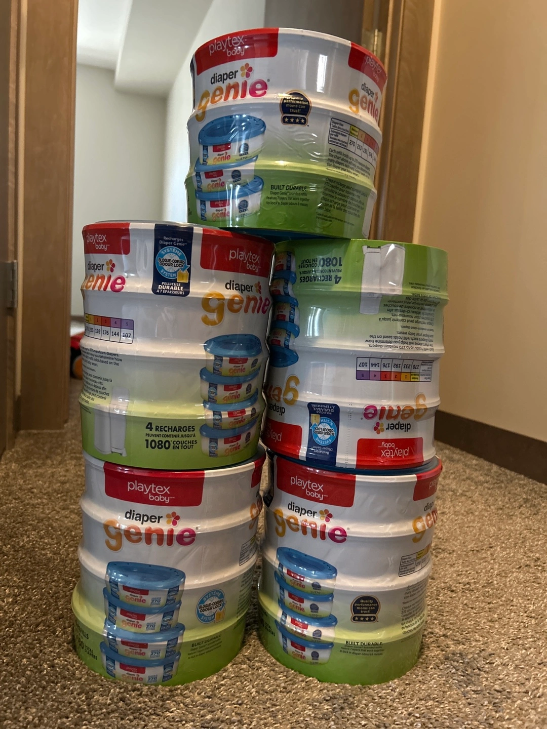 Selling total of 19 refills for Playtex Diaper Genie . Each refill can hold up to 270 newborn diapers! These refills feature 7 durable layers that work together to lock in odours and messes