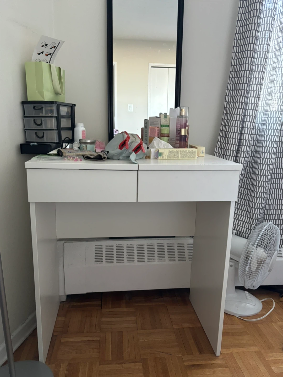 Selling a white IKEA Malm dressing table. It's in great condition and perfect for a small space! This sleek and simple vanity table offers a clean look and practical storage with its smooth-running drawer. It fits nicely in any room and is easy to keep tidy
