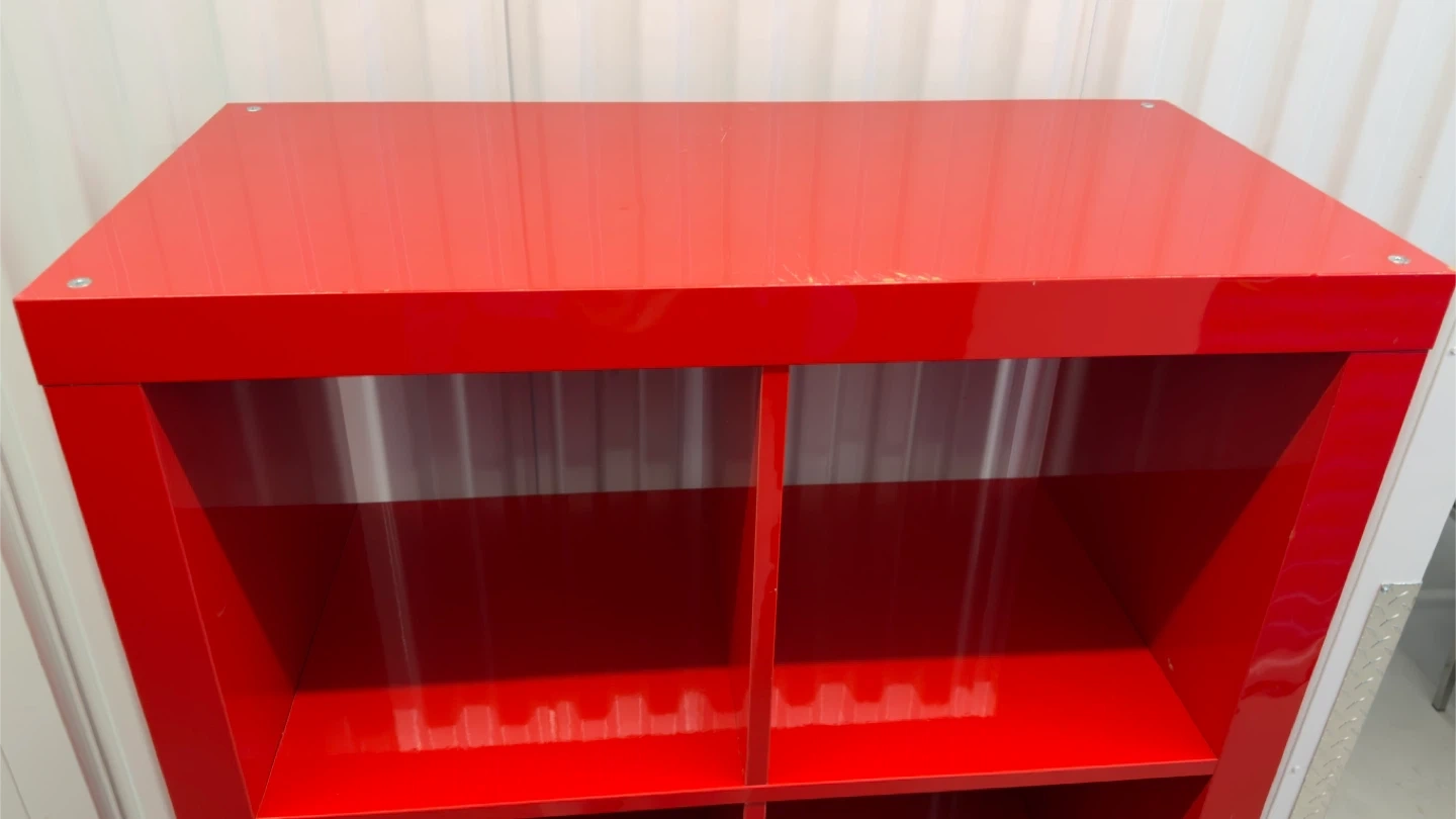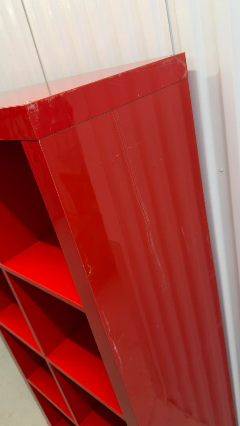 This is a red cube storage unit with 8 individual cubes. It's made of a glossy material and is great for organizing books or display items. The unit has some minor scuffs on the sides and top.Overall condition 6/10.Dimensions:59*31*16in.