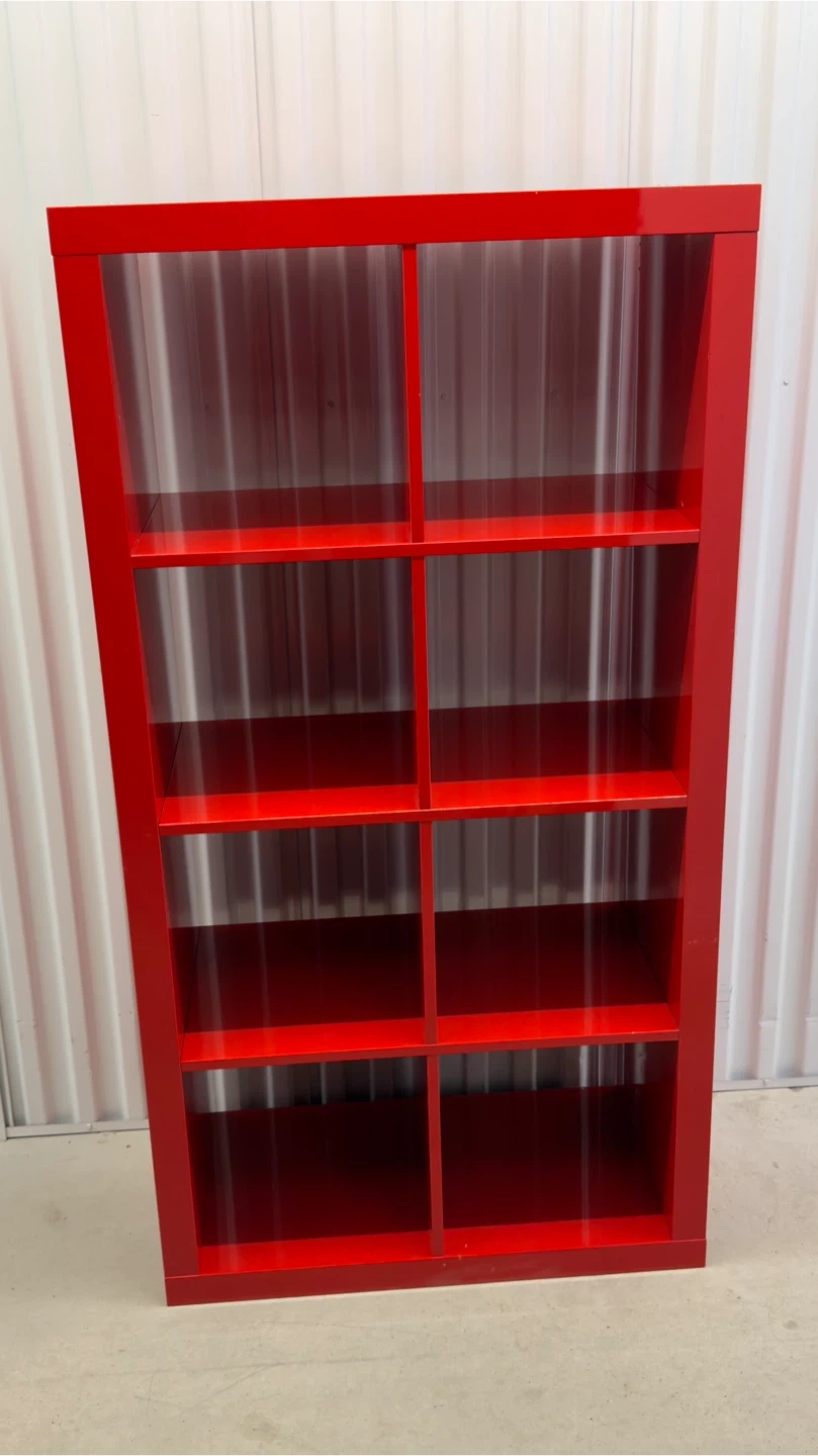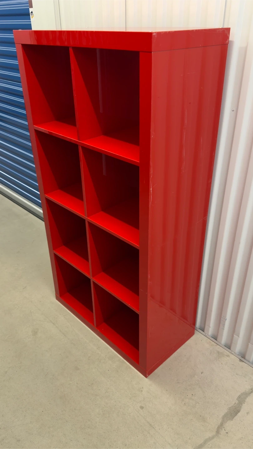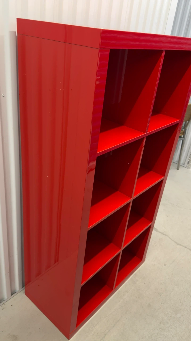 This is a red cube storage unit with 8 individual cubes. It's made of a glossy material and is great for organizing books or display items. The unit has some minor scuffs on the sides and top.Overall condition 6/10.Dimensions:59*31*16in.