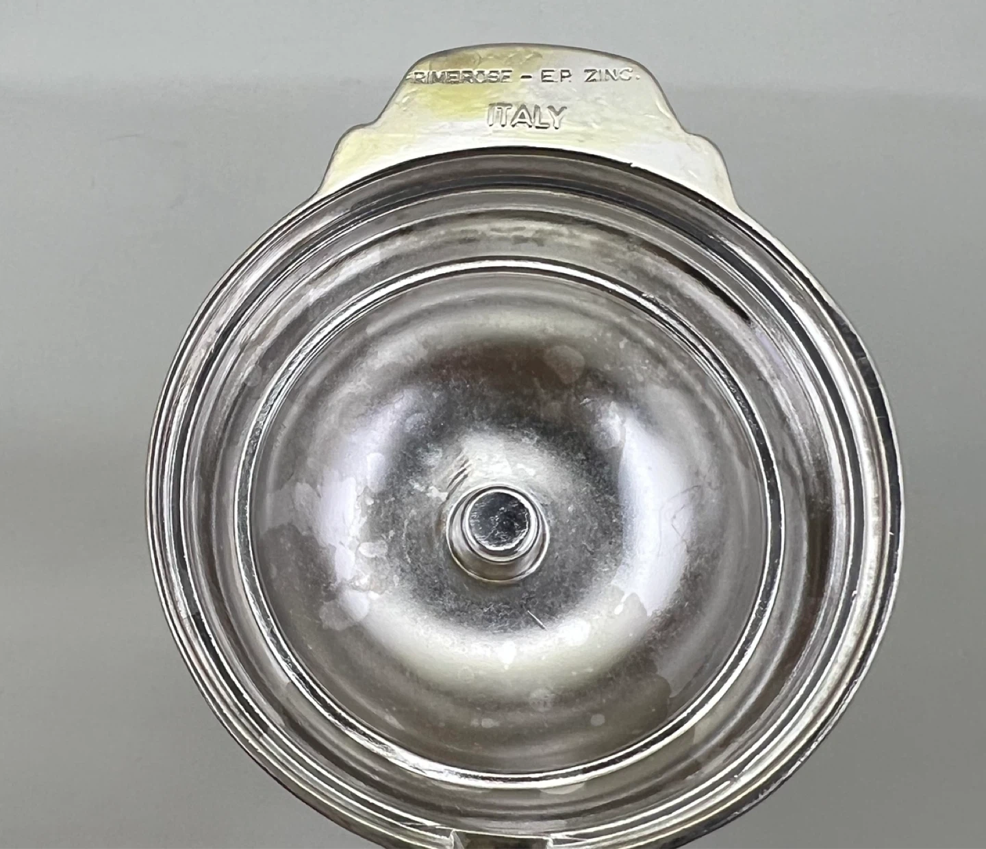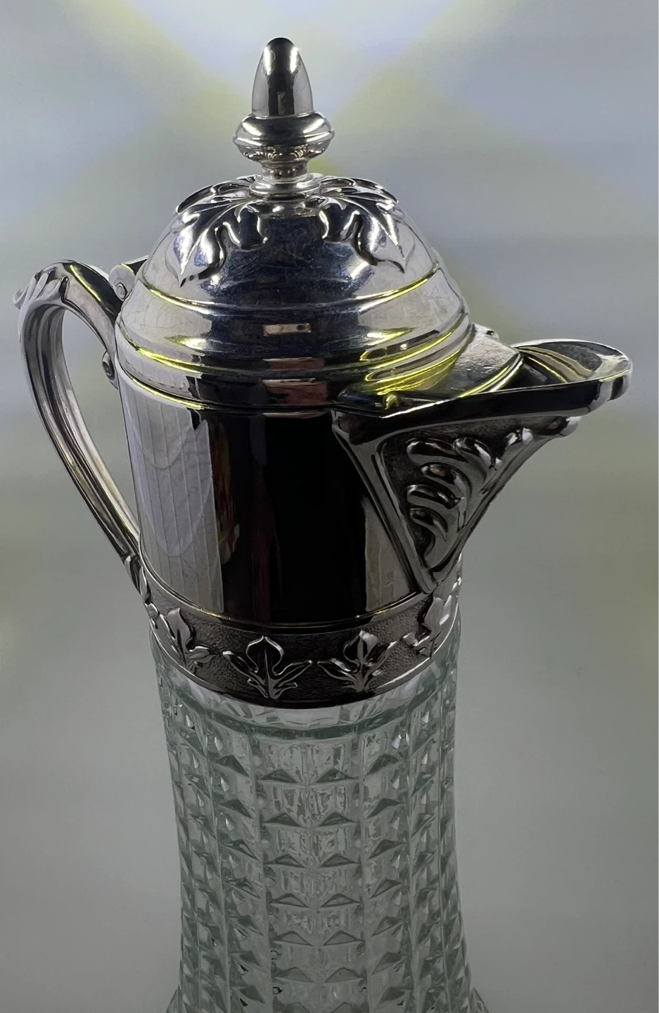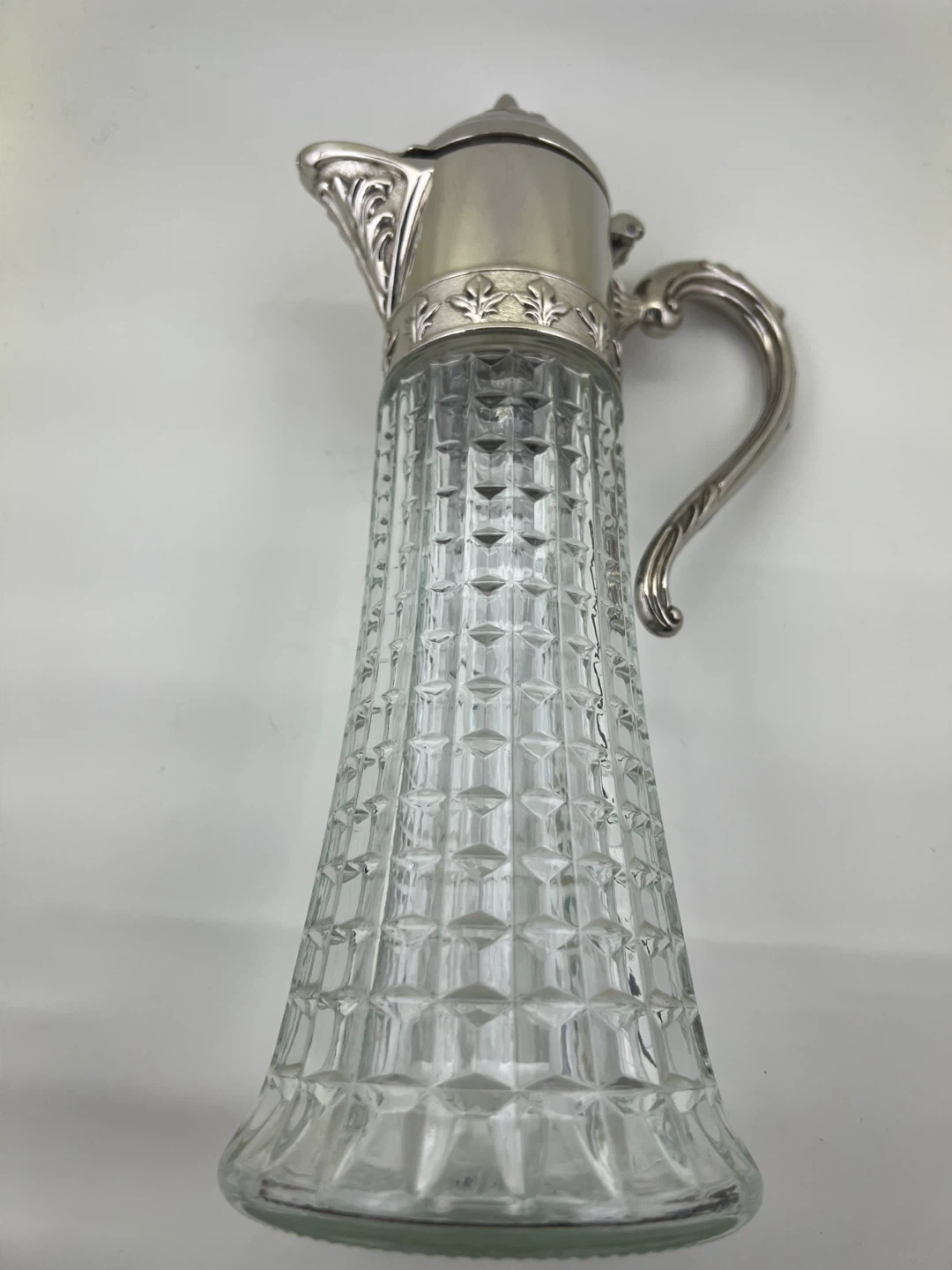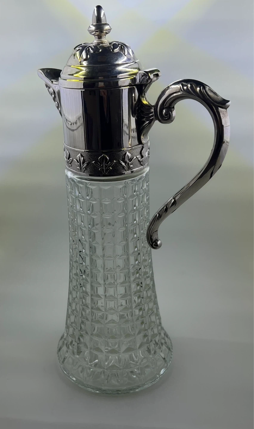 A tapered glass body with a textured, quilted diamond pattern and a silver-plated lid, spout, and handle