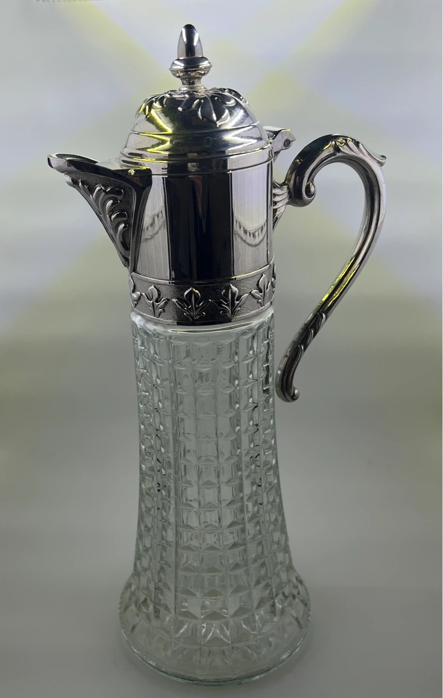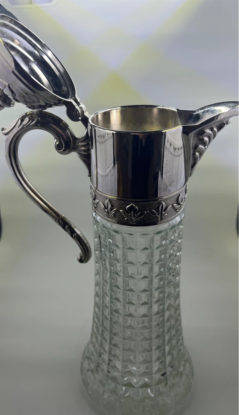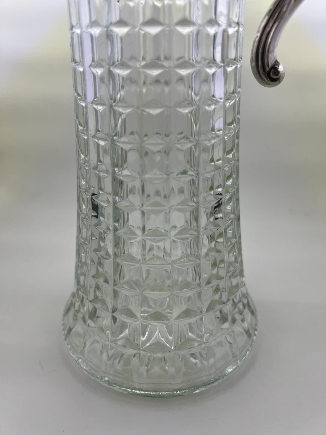 A tapered glass body with a textured, quilted diamond pattern and a silver-plated lid, spout, and handle