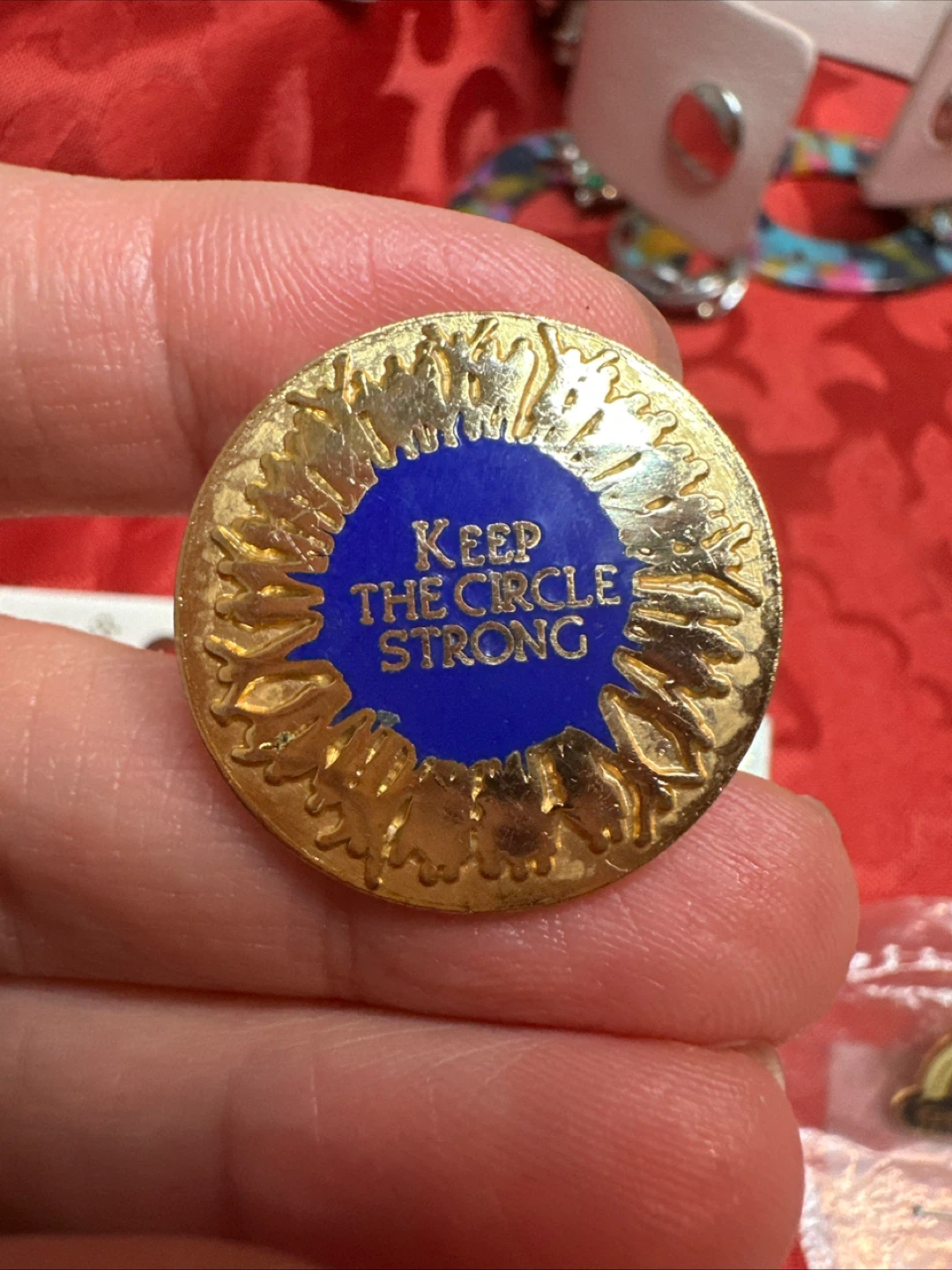 This is a 'Keep The Circle Strong' pin. It features a gold-tone border with a blue enamel center. The pin is round.