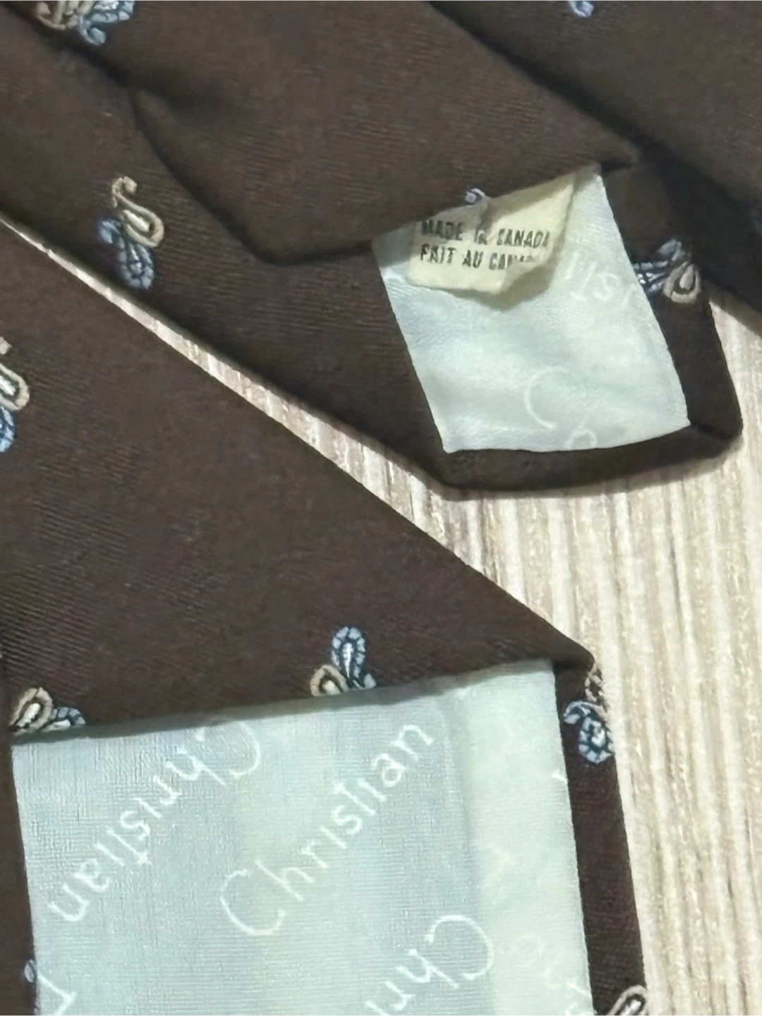 Vintage Brown Christian Dior Monsieur tie with a paisley pattern. Made in Canada. 90% polyester, 10% silk.