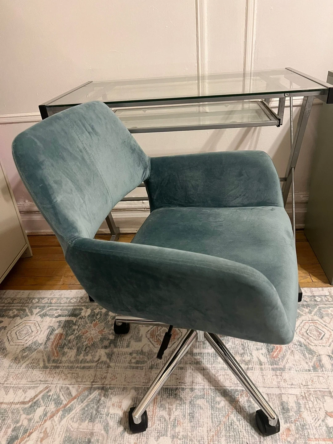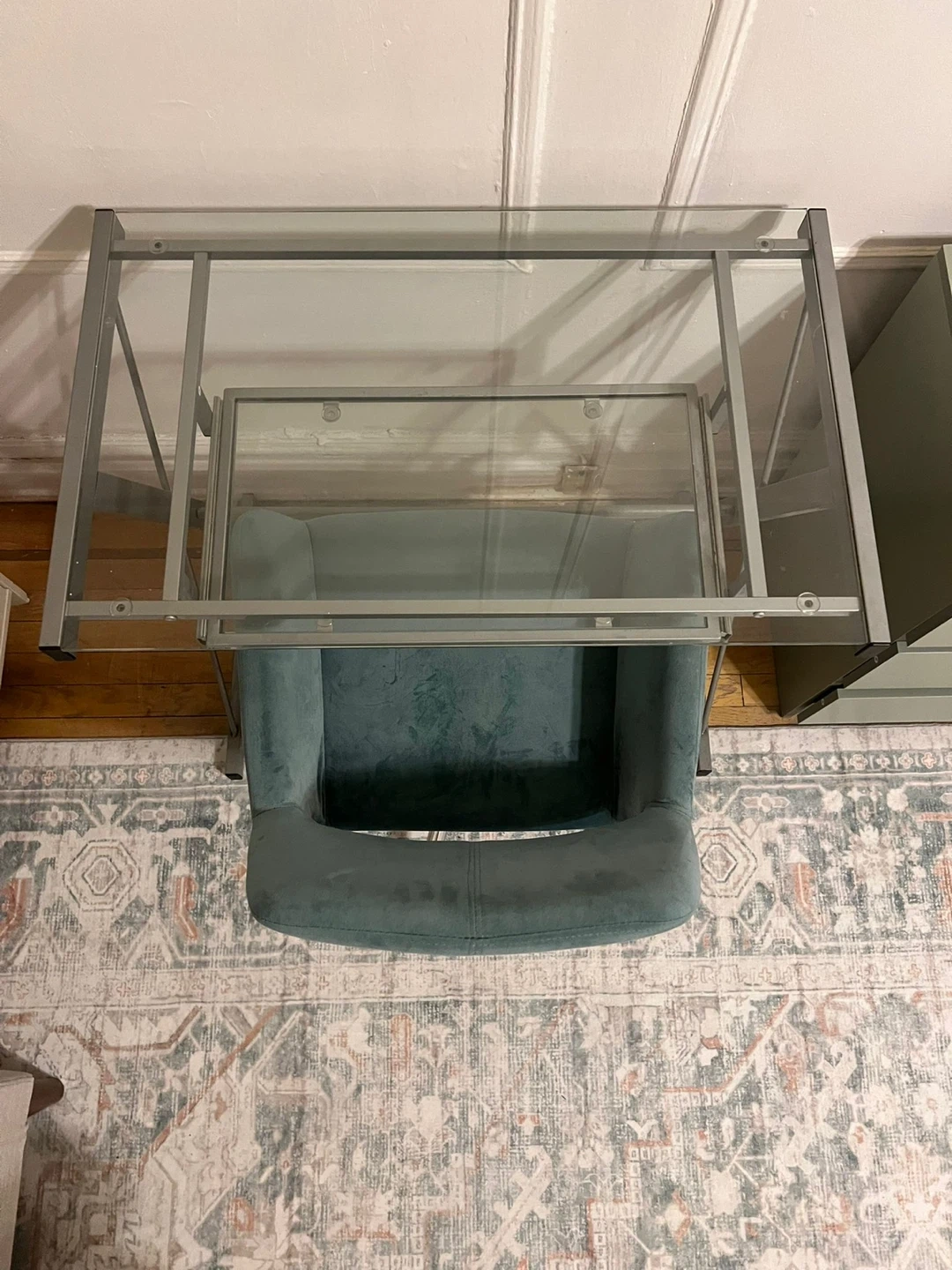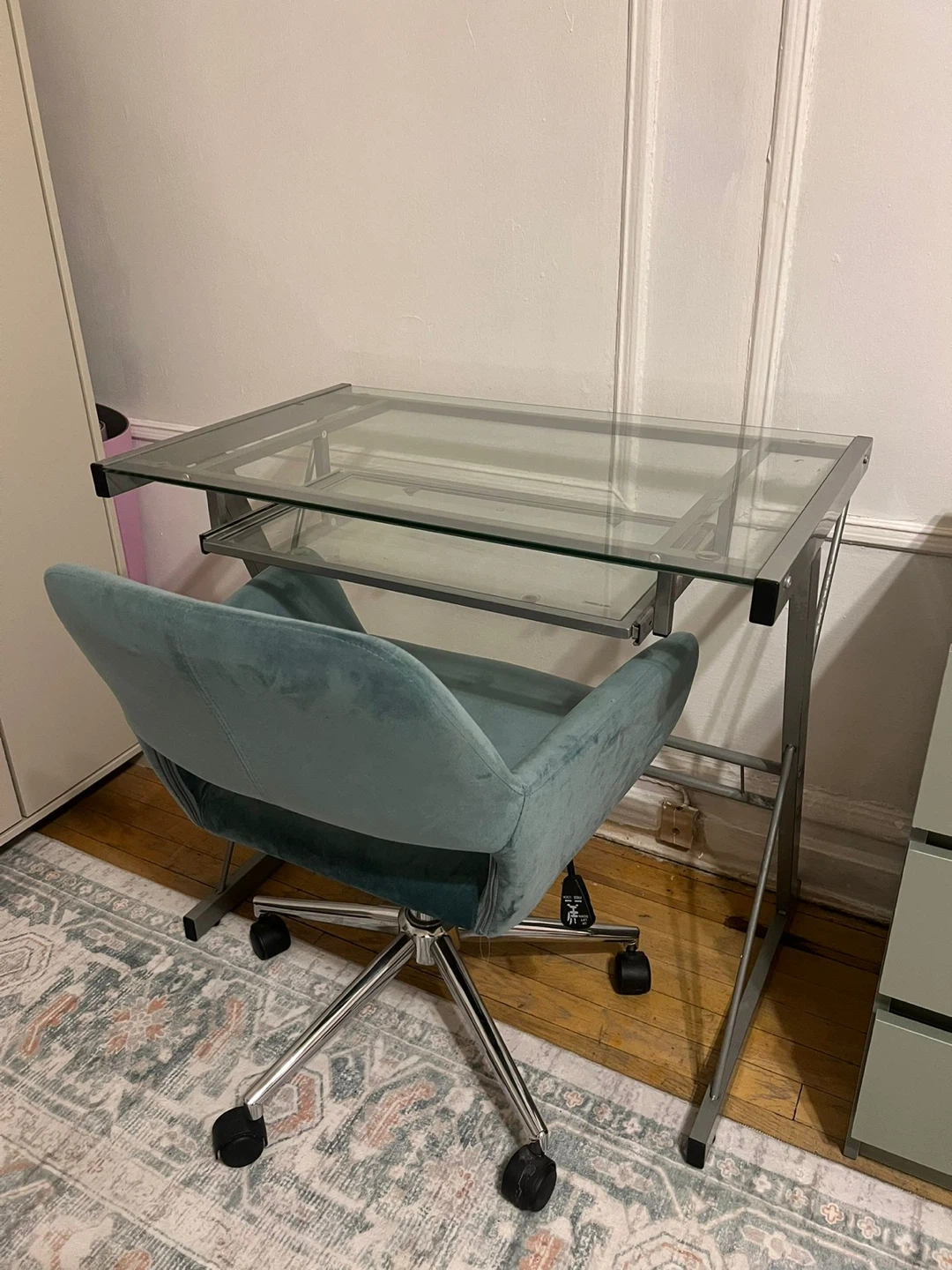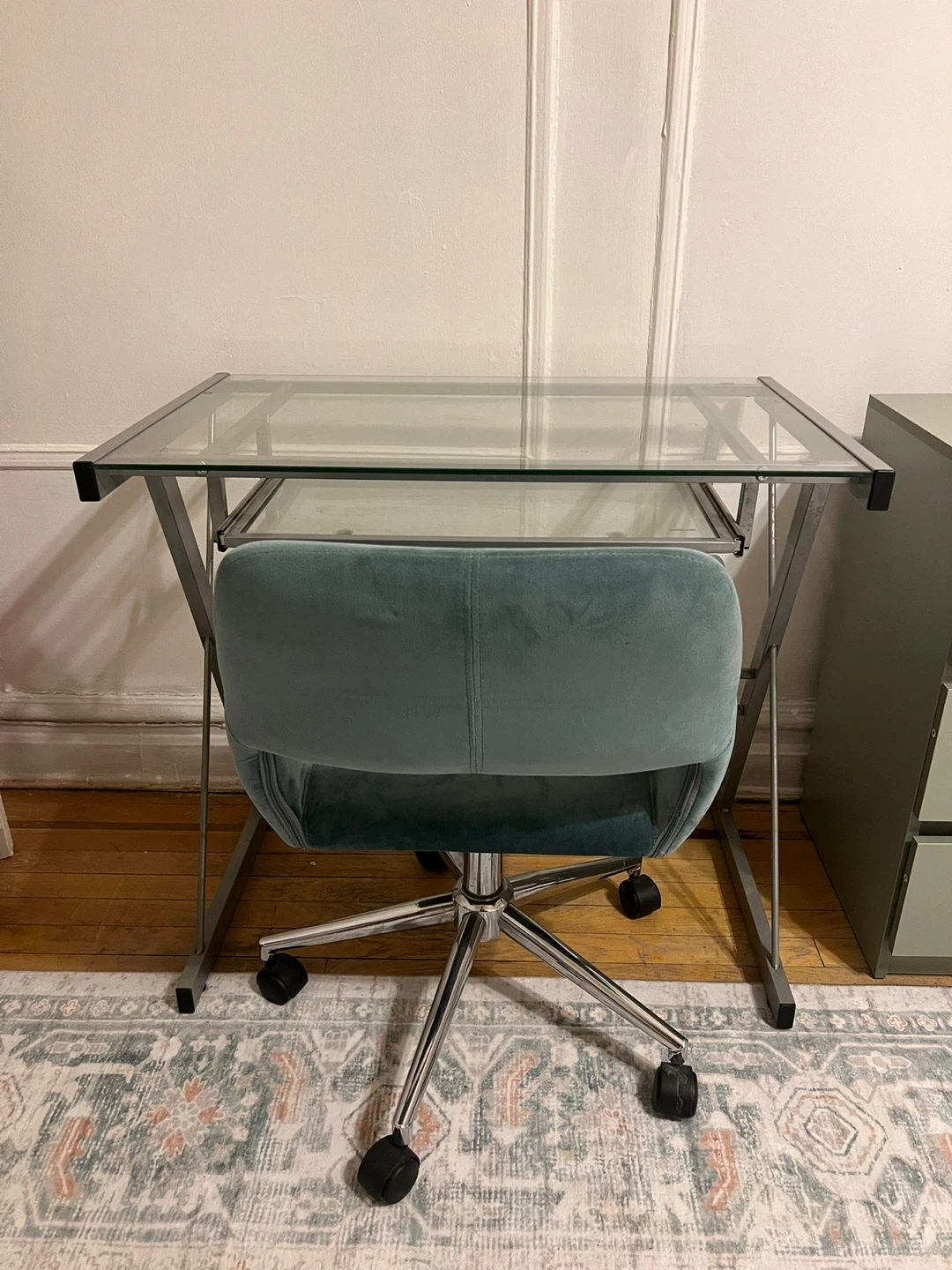Selling a desk with a glass top and a super comfy teal velvet office chair. Perfect for a home office or study space