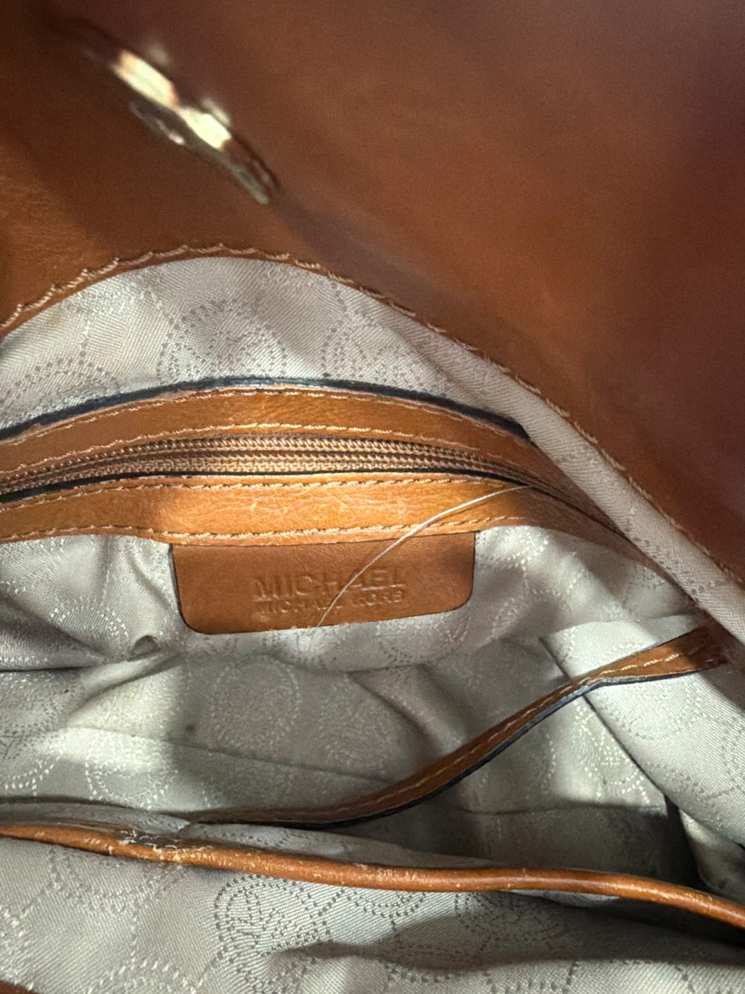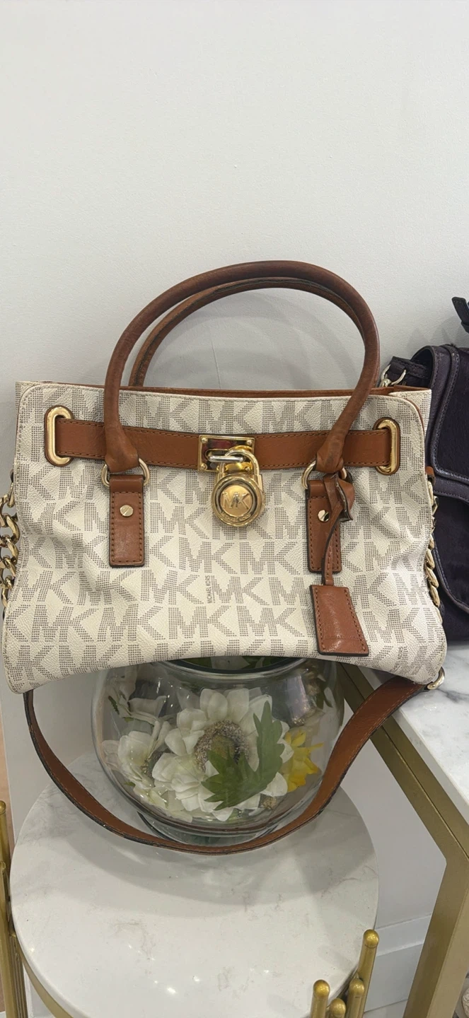 This is a Michael Kors Hamilton satchel handbag. It's made of canvas with leather trim and gold-tone hardware. It features a zip-top closure and dual handles with an optional shoulder strap. Plenty of space inside for all your essentials!