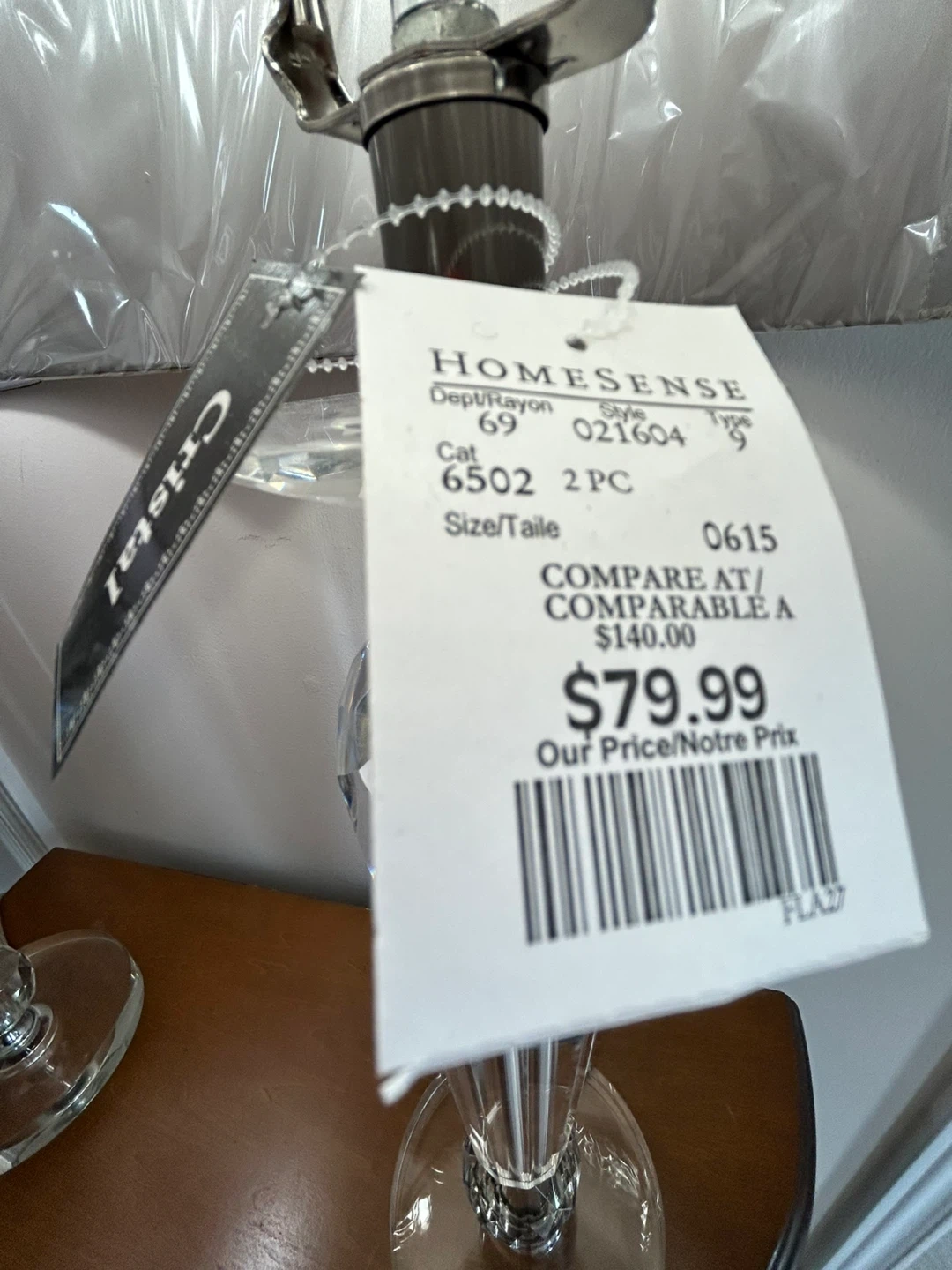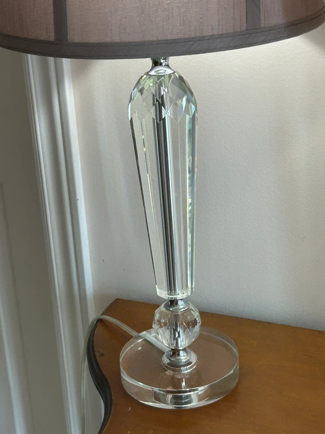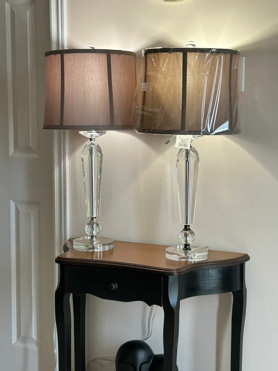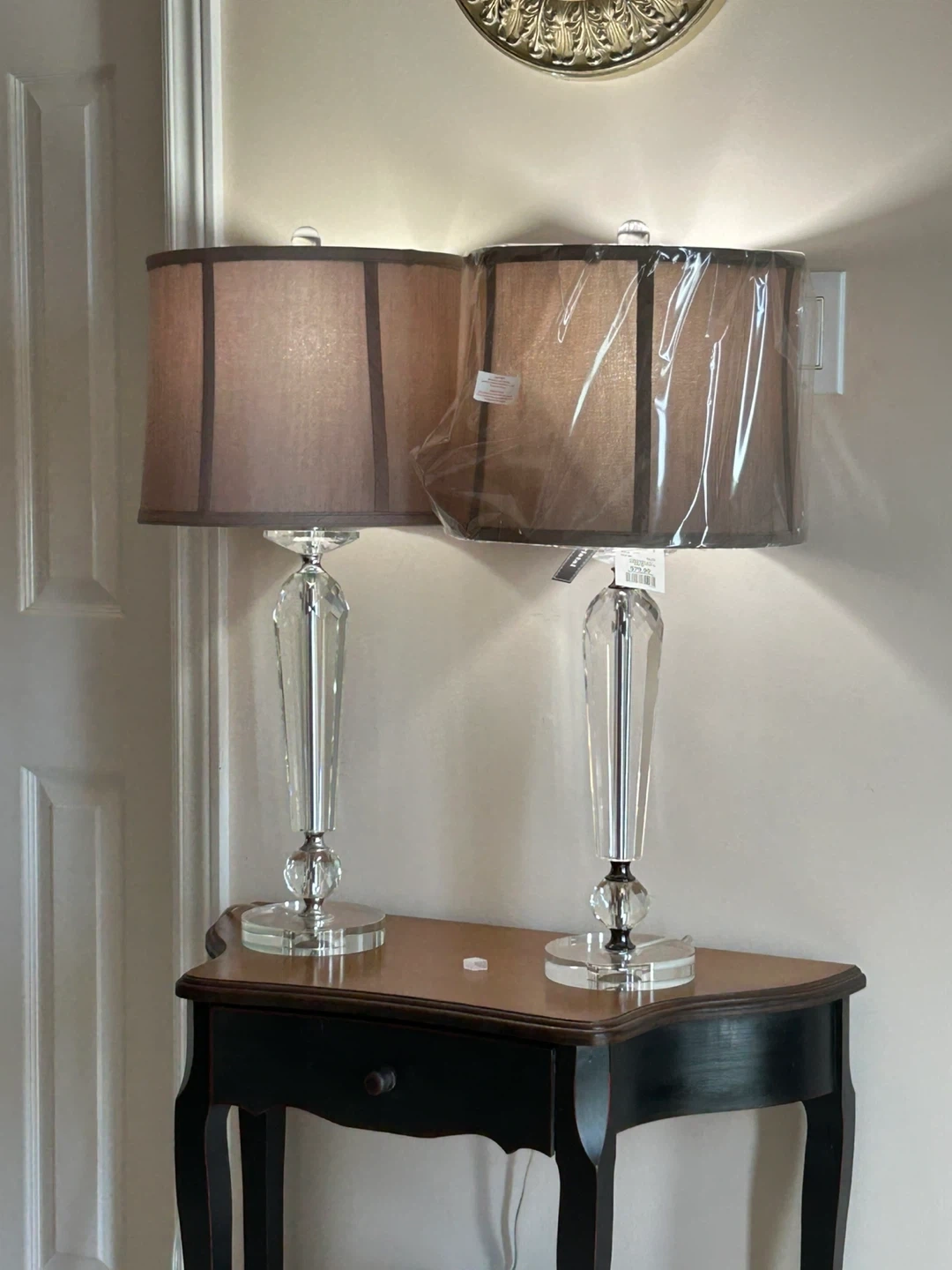 Beautiful Homesense crystal table lamps. This set includes two lamps with elegant crystal bases and fabric shades. They're perfect for adding a touch of sophistication to any room.