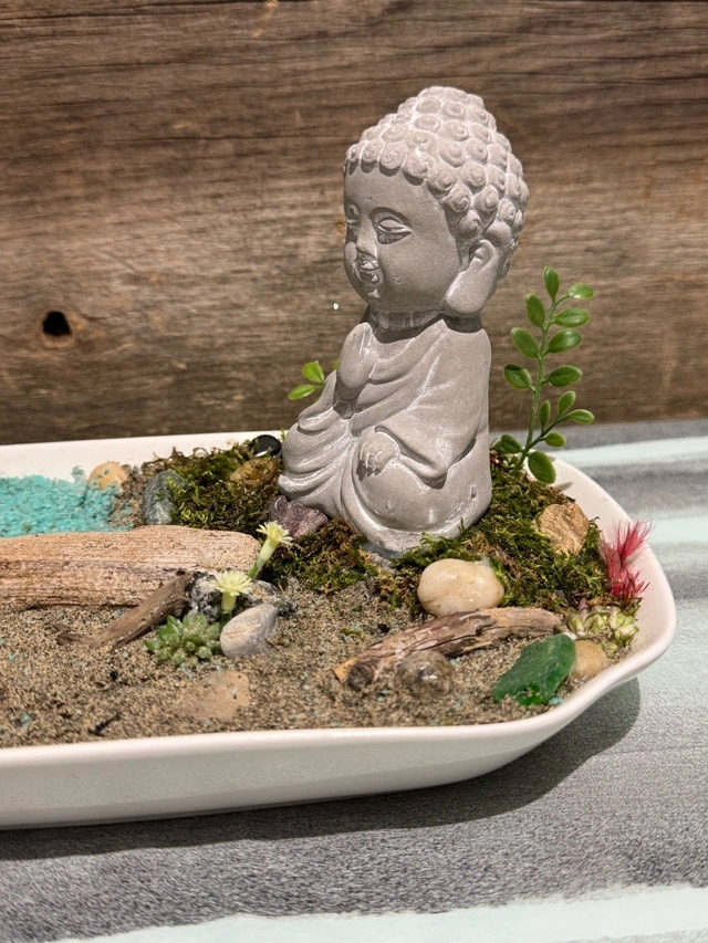 Enhance your living space with this captivating Buddha zen garden, featuring a serene Buddha statue, artfully arranged succulents, decorative rocks, and tranquil sand, all nestled in a sleek white dish. This unique piece brings a sense of peace and harmony to any room, inviting moments of reflection and calm. This zen garden is ready to bring a sense of peace to your home. If this ad is still up, the Buddha zen garden is available and waiting to find its new home! Cash accepted, Cashless payment accepted.