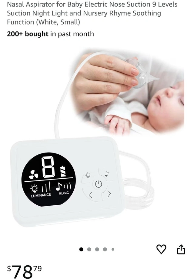 New electric nasal aspirator for baby. Features 9 levels of suction, a night light, and soothing nursery rhymes. White, small size. Retails for $78.79 on Amazon. Asking $40. Pick up near Coxwell and Danforth.