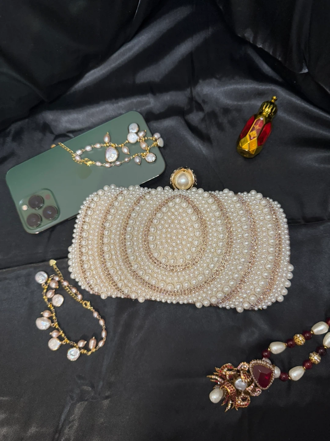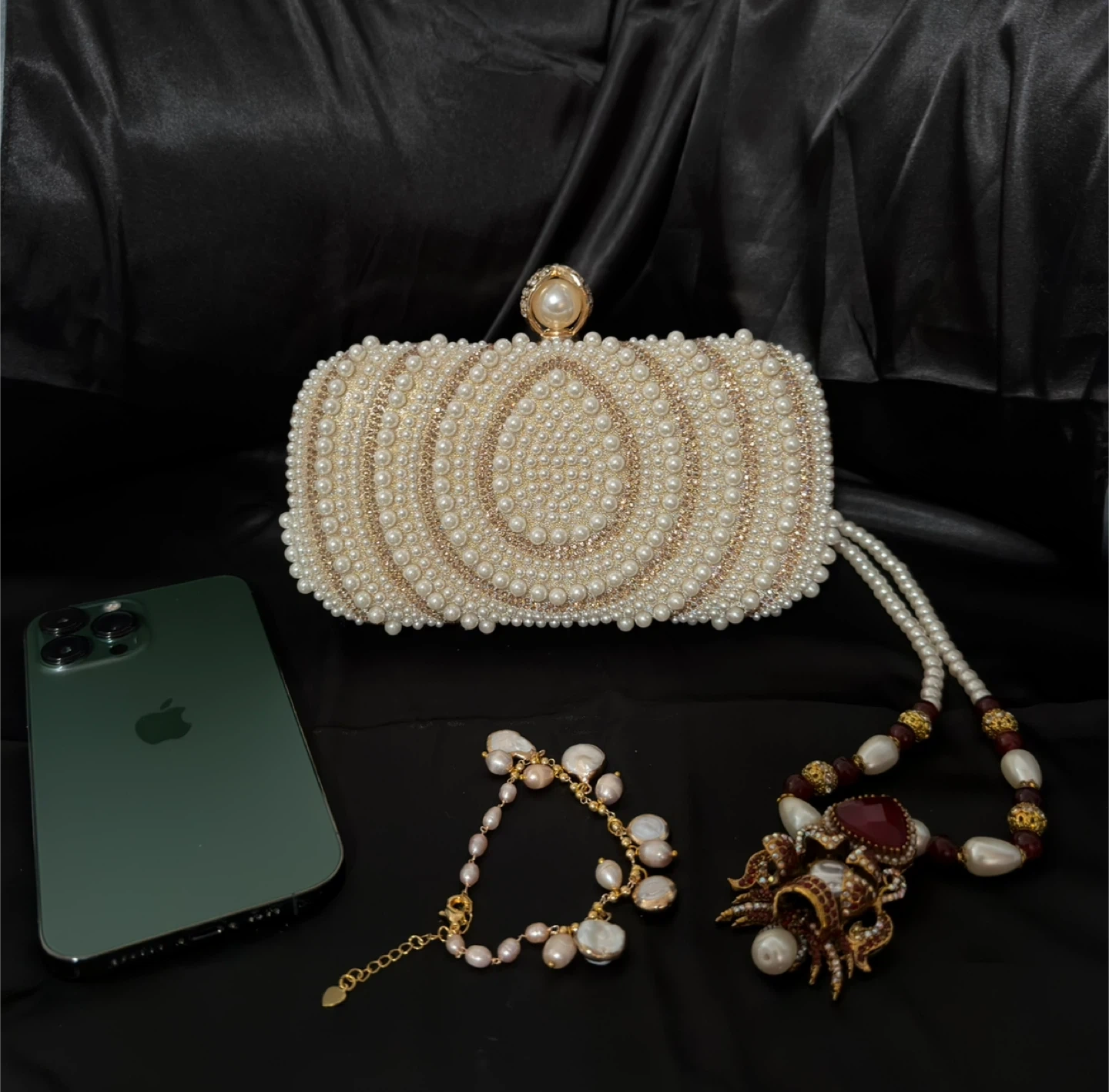 Beaded Clutch Bag with Pearl. Fits iPhone pro max