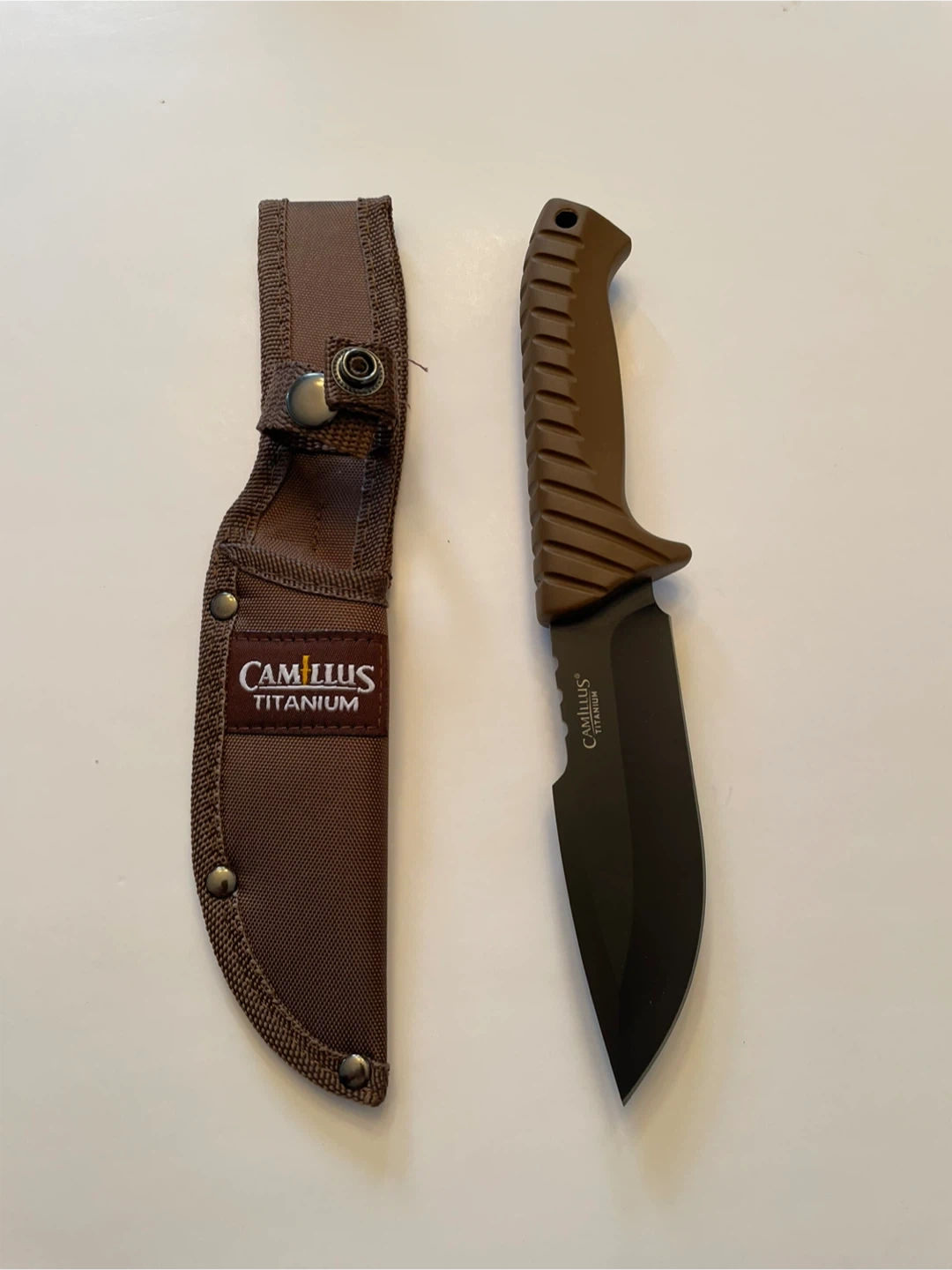 This is a Camillus Titanium knife with a brown handle and a black blade. It includes a brown sheath for storage and transport. The knife has a durable construction suitable for outdoor activities.