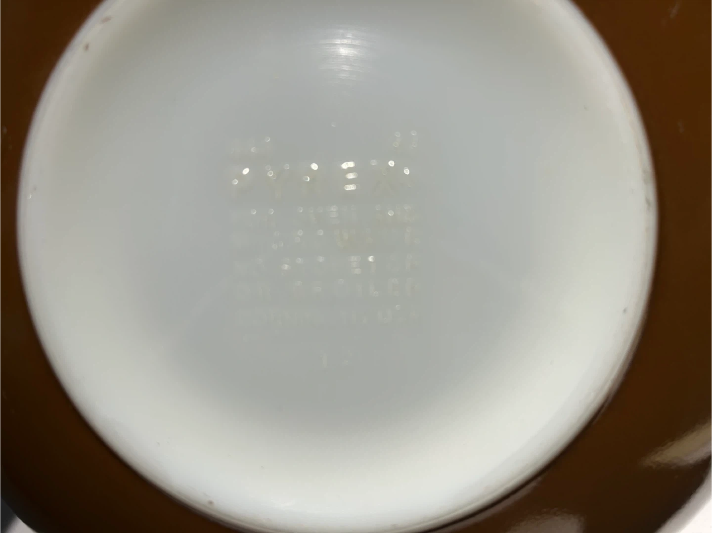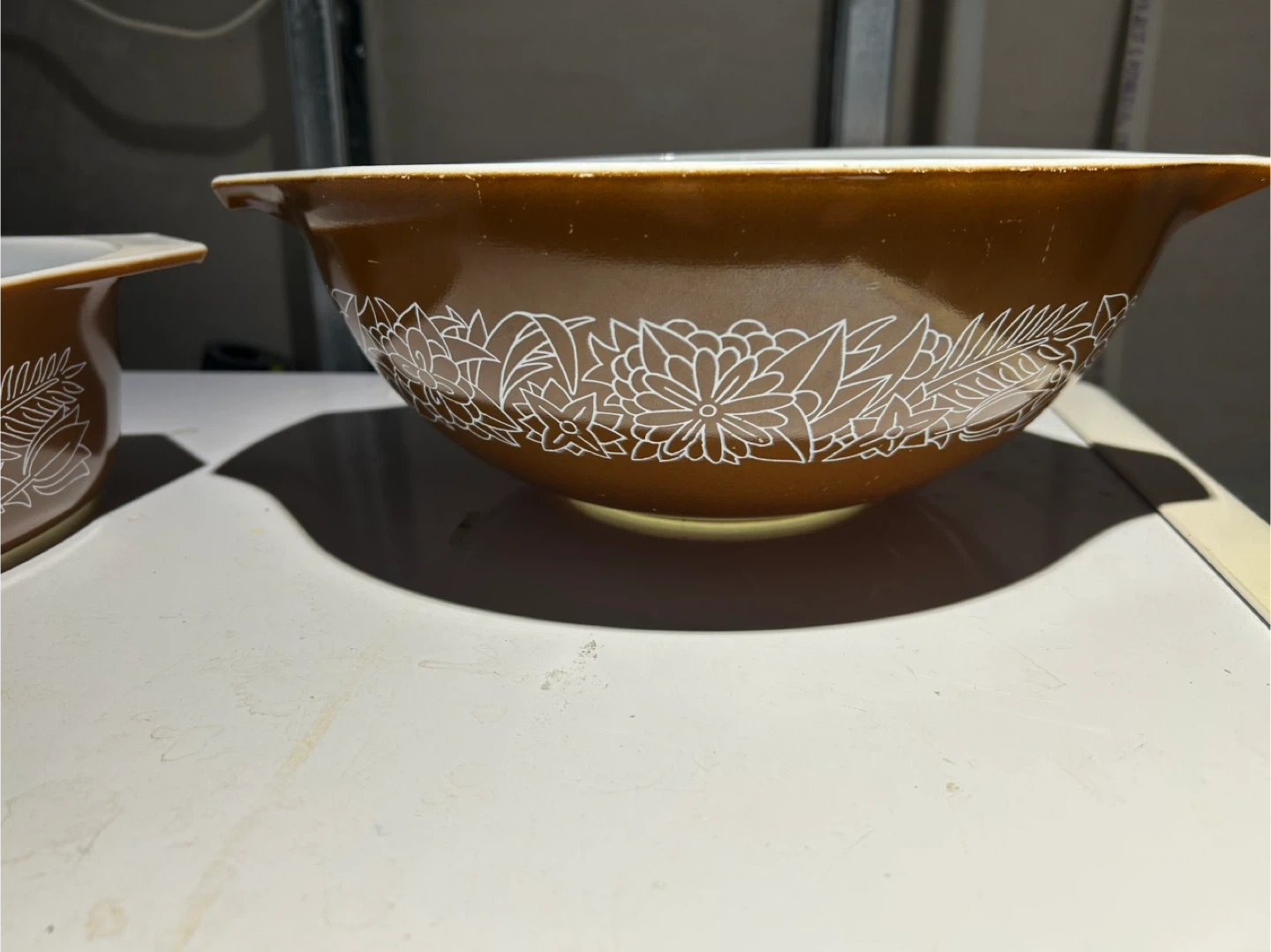 This is a set of two Pyrex mixing bowls in brown with a white floral pattern. They're made of durable milk glass. These bowls are great for mixing or serving.