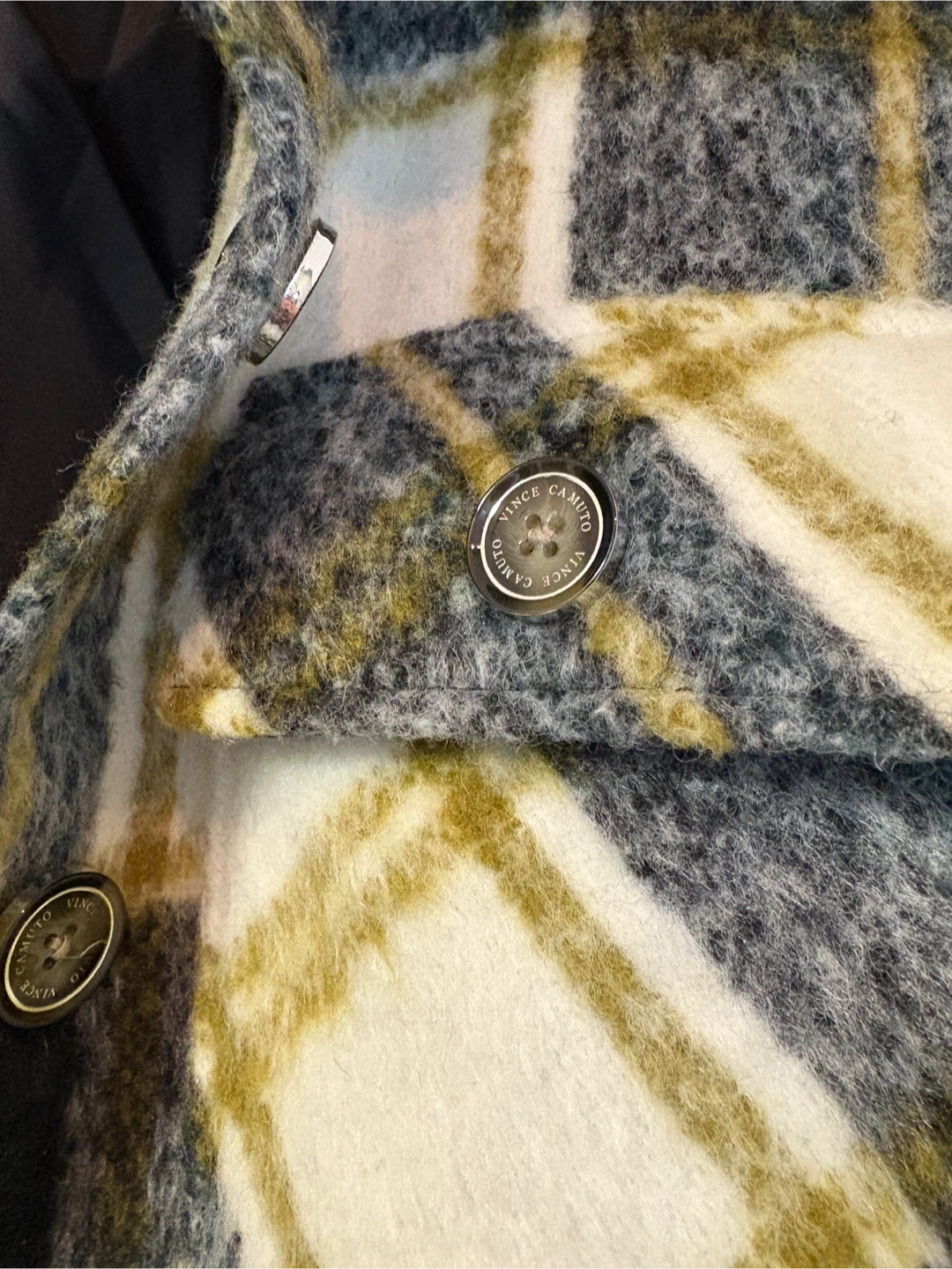 Here's a stylish plaid shirt jacket from Vince Camuto! It features a classic plaid pattern in black, white, and gold tones. Perfect for adding a touch of cozy chic to your wardrobe. pit to pit 20”