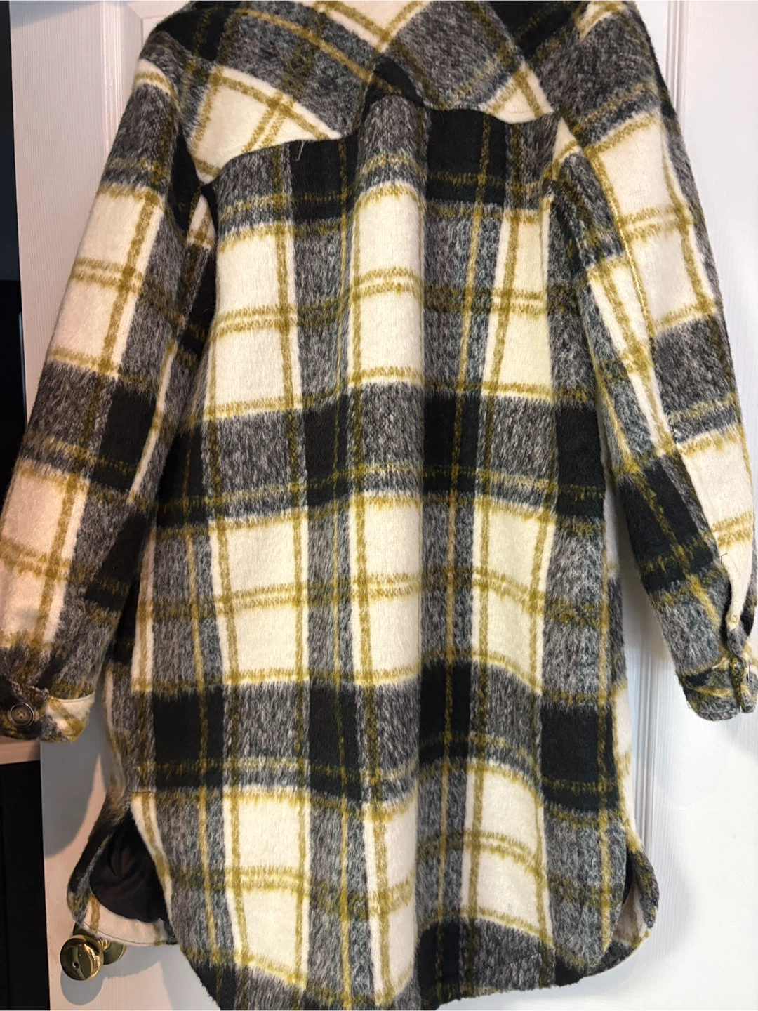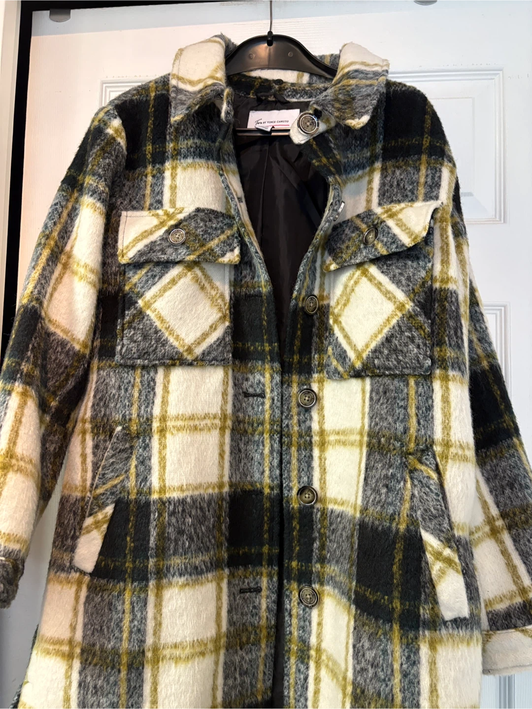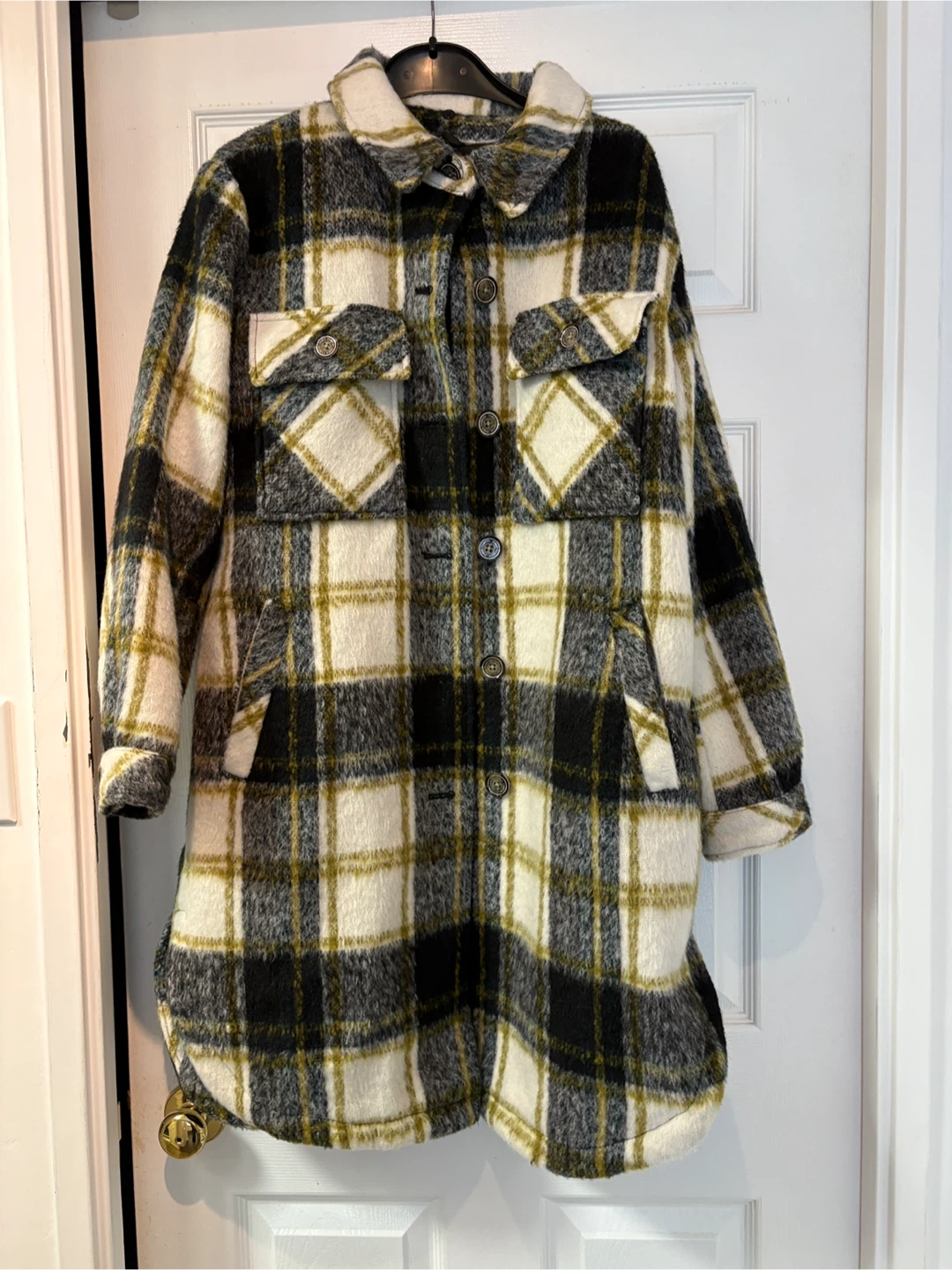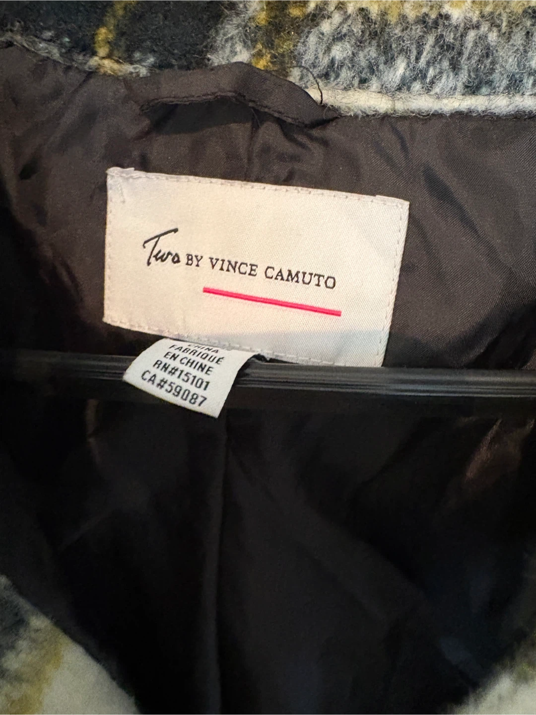Here's a stylish plaid shirt jacket from Vince Camuto! It features a classic plaid pattern in black, white, and gold tones. Perfect for adding a touch of cozy chic to your wardrobe. pit to pit 20”