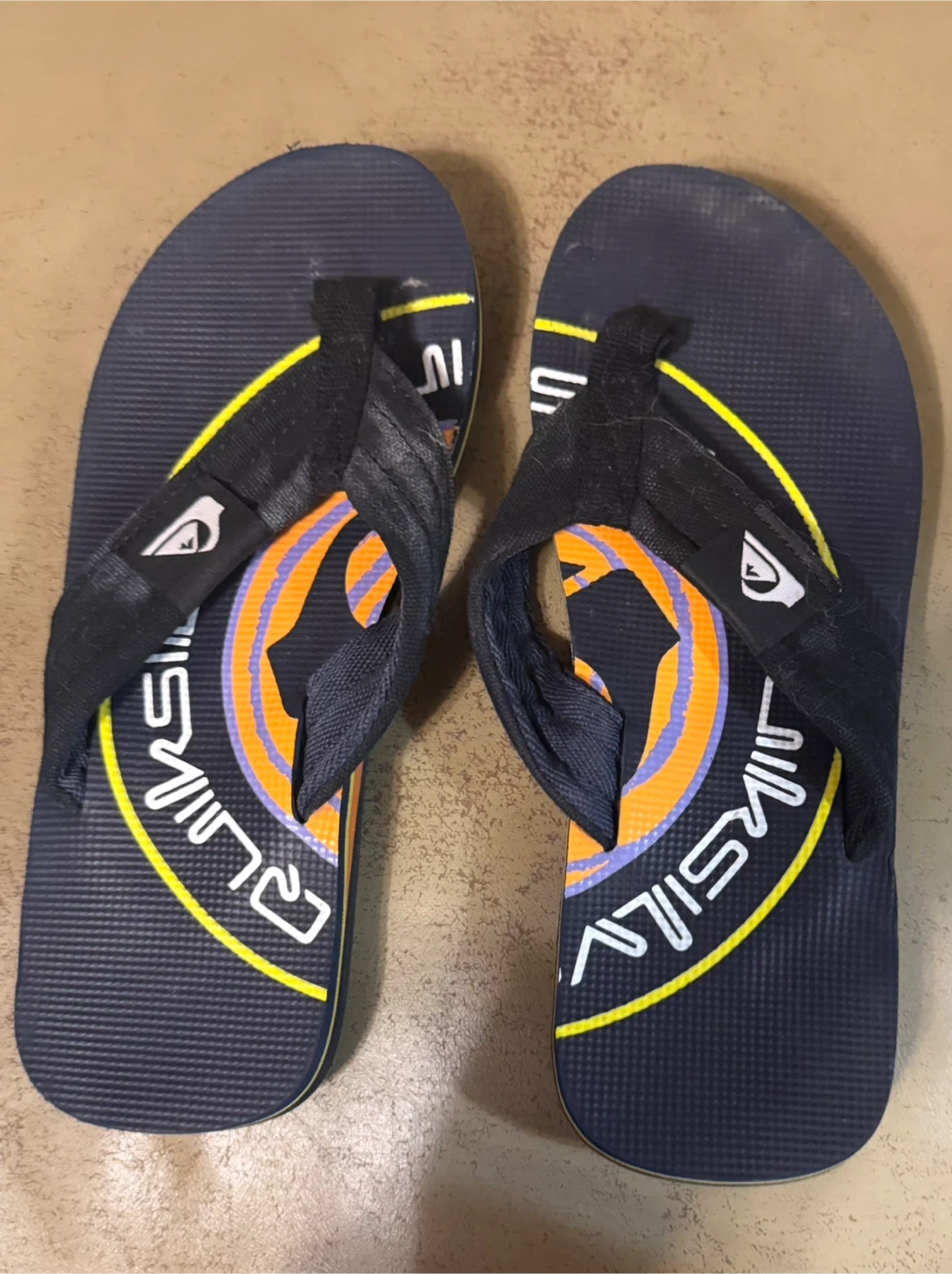 Quiksilver flip flops with a blue, orange, and yellow design. These are slip-on style with fabric straps. Great for casual wear or the beach!