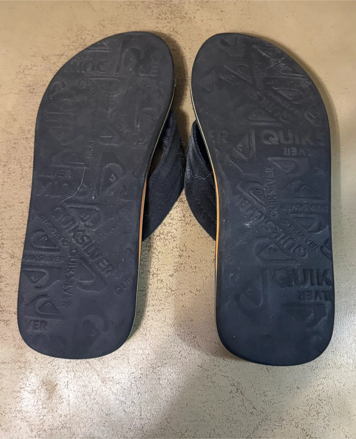 Quiksilver flip flops with a blue, orange, and yellow design. These are slip-on style with fabric straps. Great for casual wear or the beach!