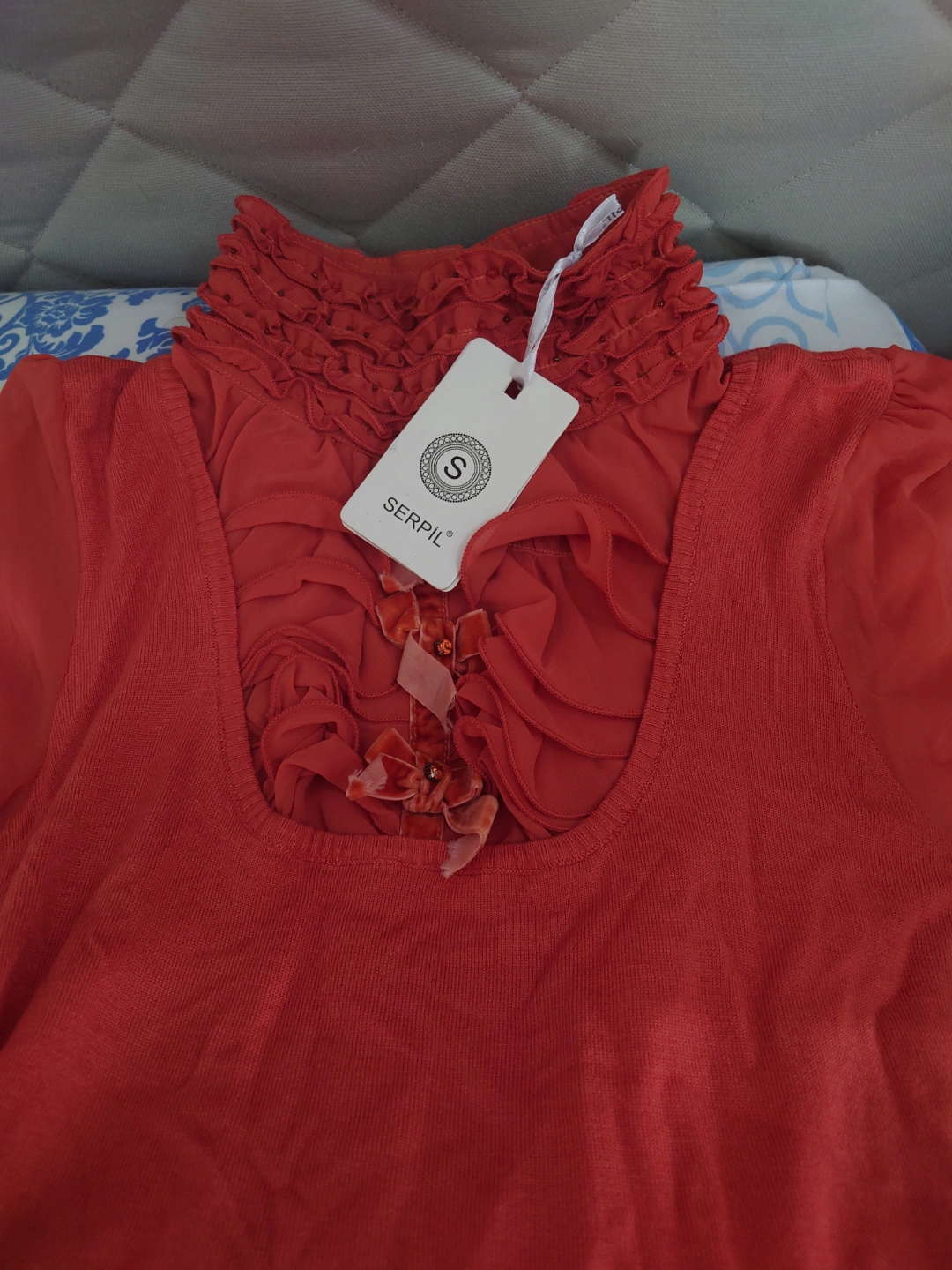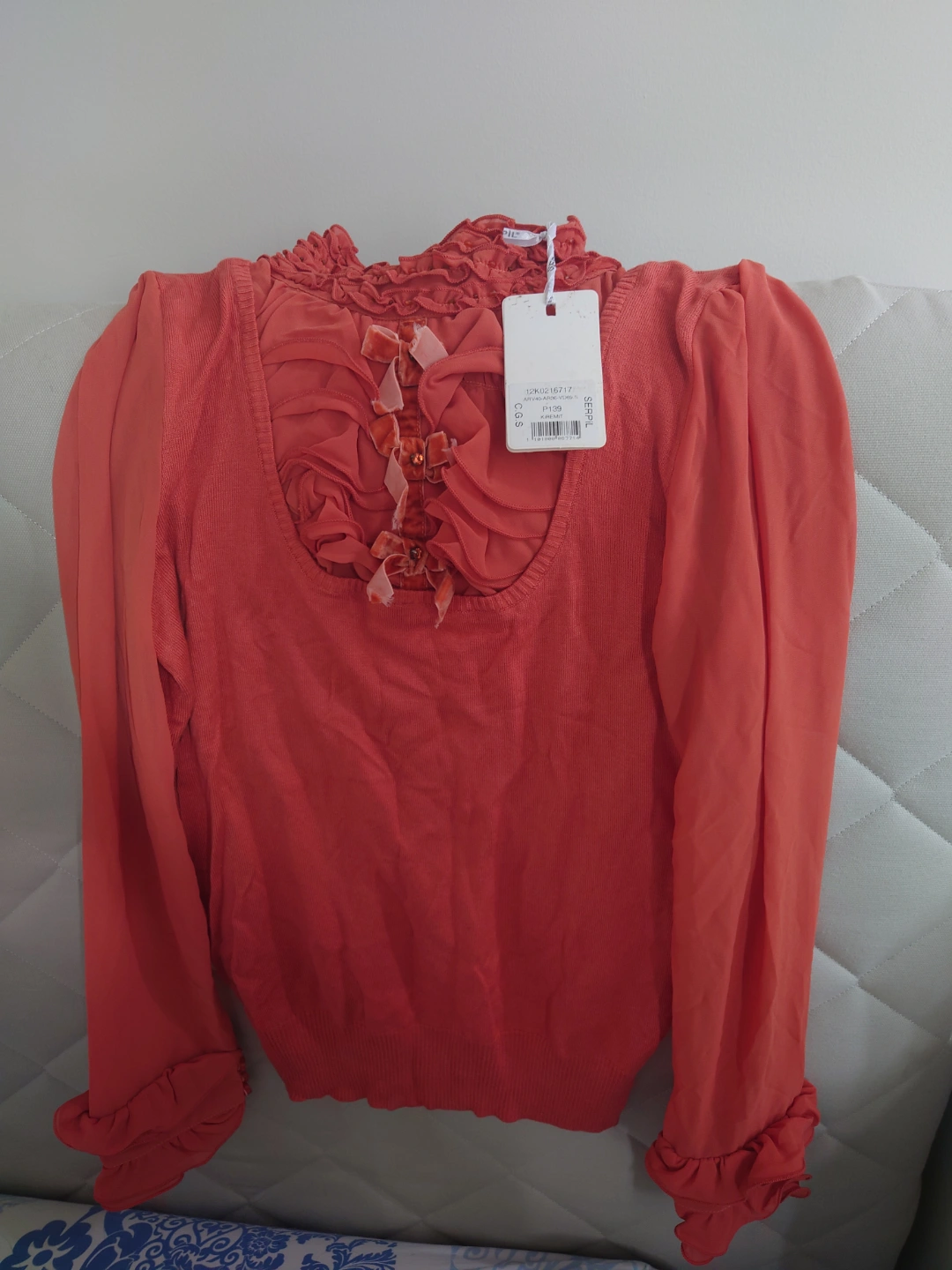 Unique coral coloured women's blouse. Features a mock neck with ruffles and a sheer overlay with velvet ribbon accents. Long sleeves with ruffled cuffs.