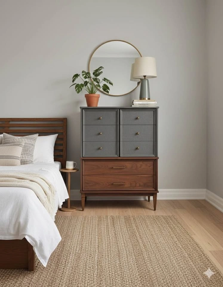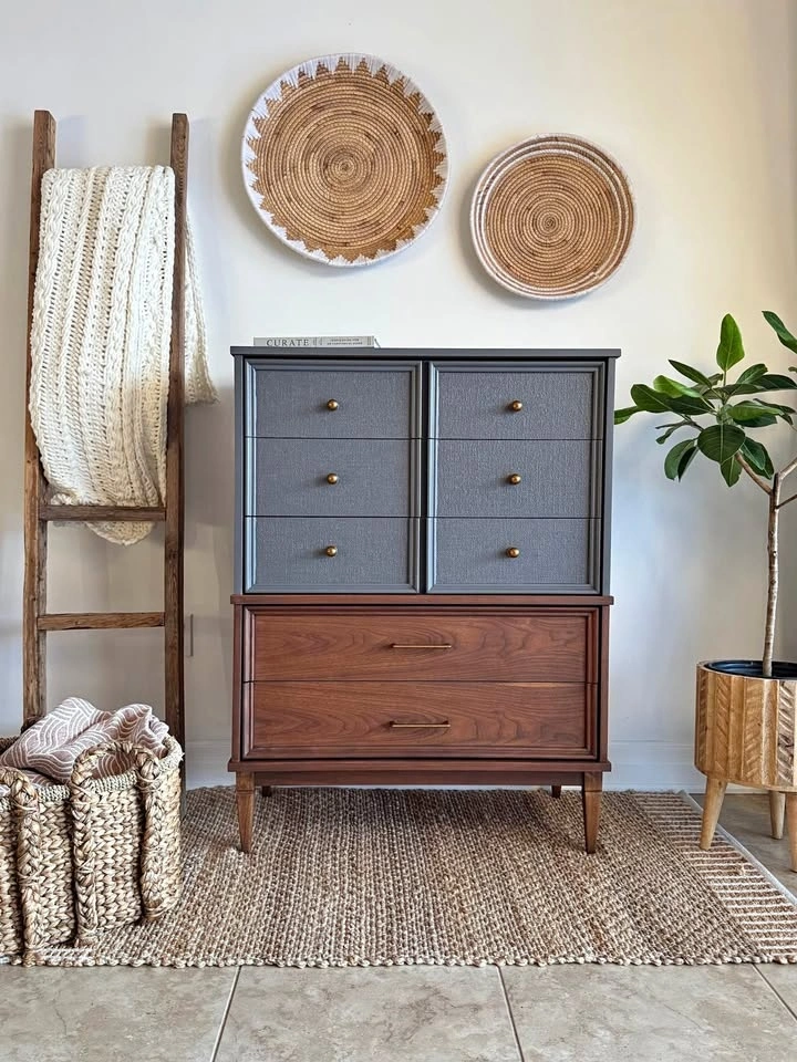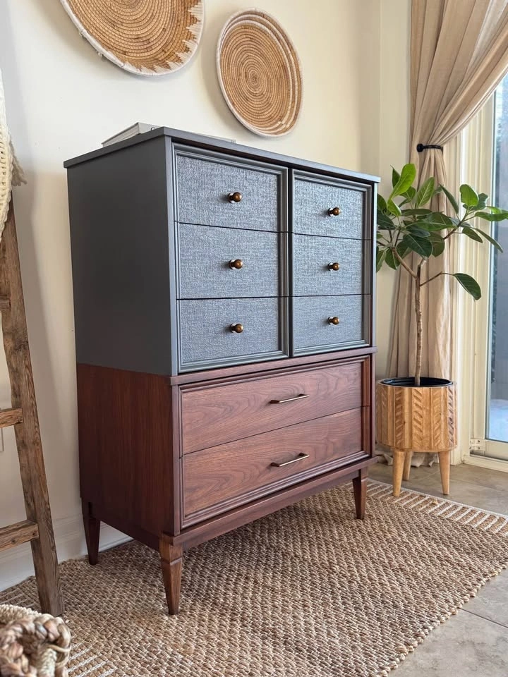 Professionally refinished vintage 5-drawer MCM dresser featuring solid dovetail joints. Reimagined with a reverse paint-dipped design in Iron Mountain—a soft black with subtle blue undertones. The upper drawers are accented with textured paper, adding depth and visual interest, while the lower portion was stripped and stained in a rich antique walnut. Finished with a durable protective seal. A beautifully functional piece in a versatile size—perfect for a bedroom, entryway, office, or anywhere you need stylish storage. Dimensions: 34” x 18” x 45.25” H. Pick Up: Brooklin (North Whitby) L1M1B7. Check out my Instagram or FB page for more of my work @greenbrushdesigns.