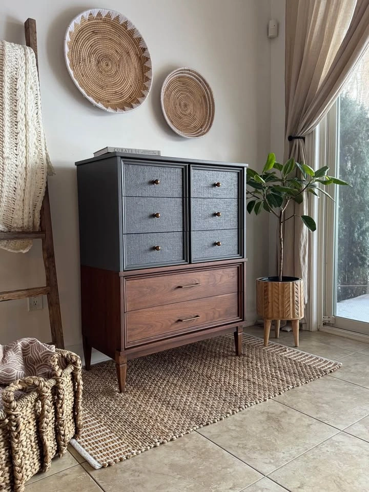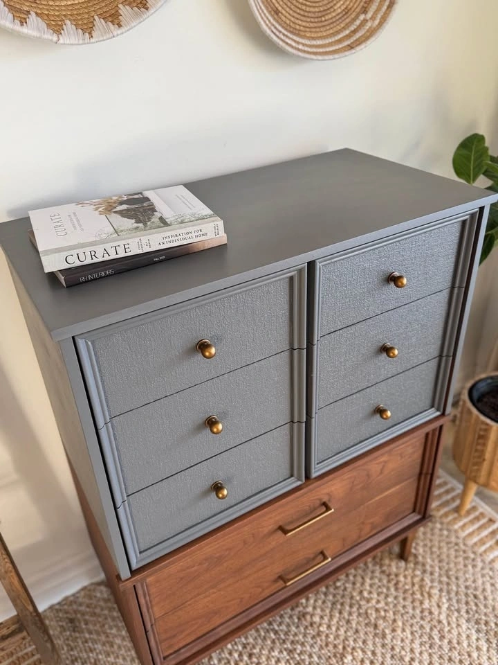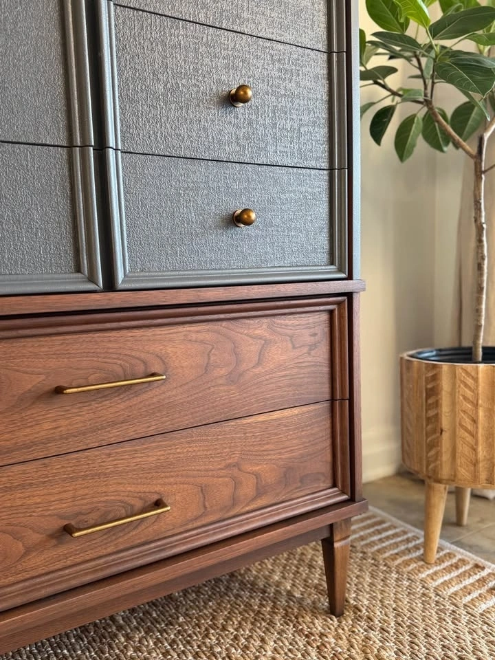 Professionally refinished vintage 5-drawer MCM dresser featuring solid dovetail joints. Reimagined with a reverse paint-dipped design in Iron Mountain—a soft black with subtle blue undertones. The upper drawers are accented with textured paper, adding depth and visual interest, while the lower portion was stripped and stained in a rich antique walnut. Finished with a durable protective seal. A beautifully functional piece in a versatile size—perfect for a bedroom, entryway, office, or anywhere you need stylish storage. Dimensions: 34” x 18” x 45.25” H. Pick Up: Brooklin (North Whitby) L1M1B7. Check out my Instagram or FB page for more of my work @greenbrushdesigns.