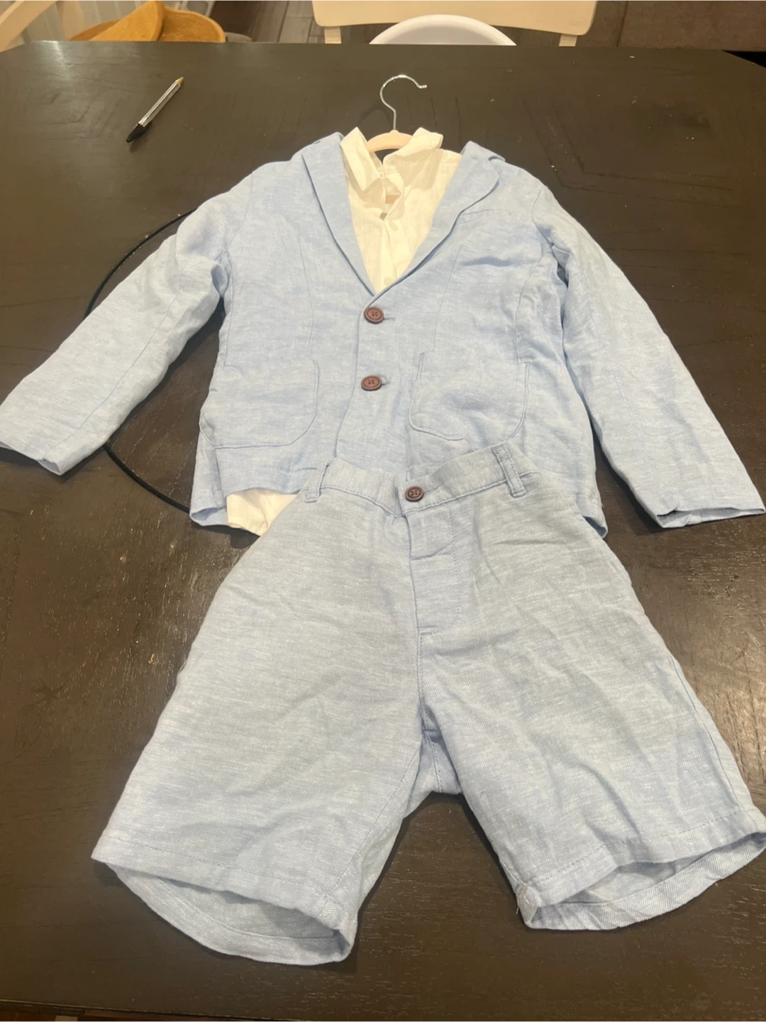 I'm selling a new NEXT boys suit set. The set includes a shirt, vest, jacket, and shorts. One shirt is size 4-5 yrs and the other is 6-7 yrs. Perfect for any special occasion!