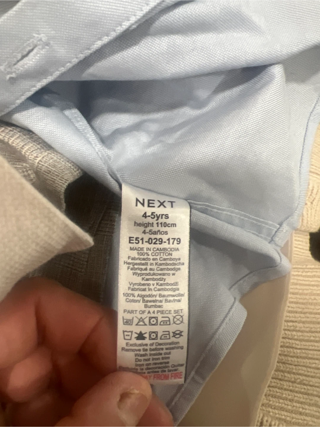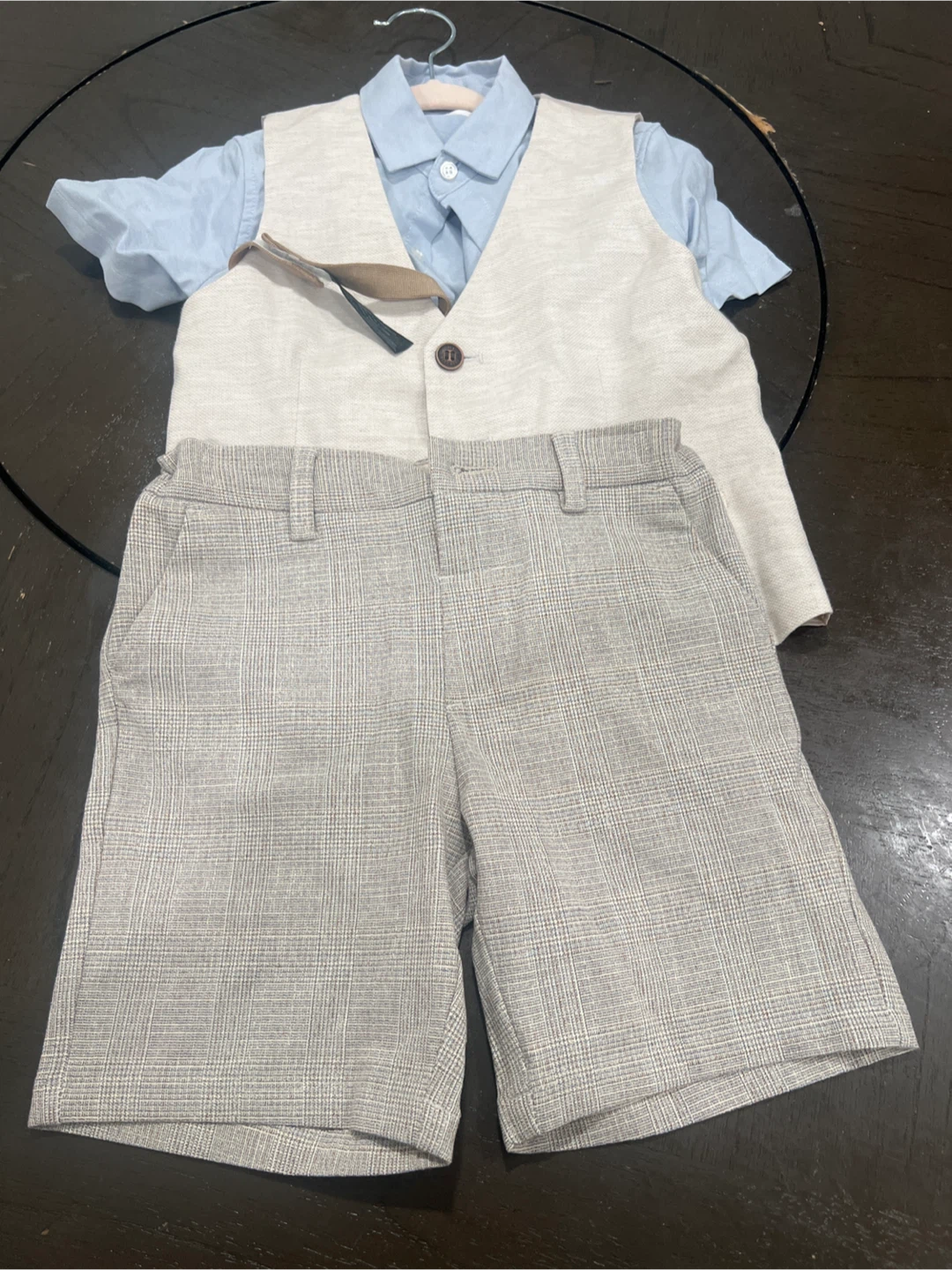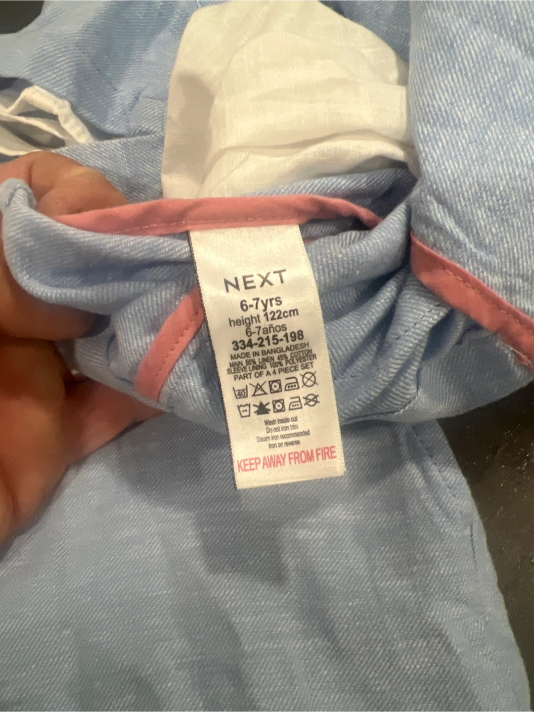 I'm selling a new NEXT boys suit set. The set includes a shirt, vest, jacket, and shorts. One shirt is size 4-5 yrs and the other is 6-7 yrs. Perfect for any special occasion!