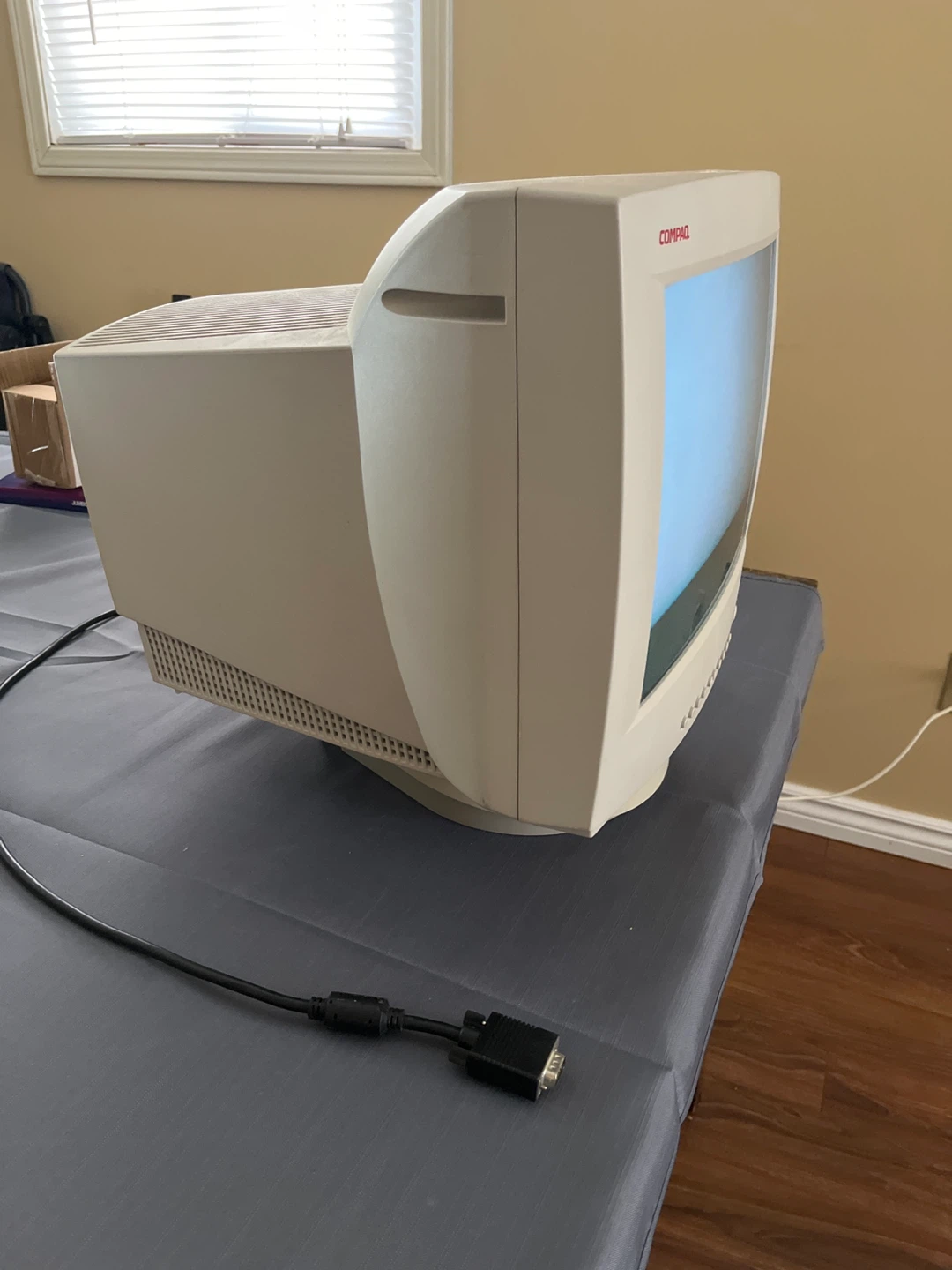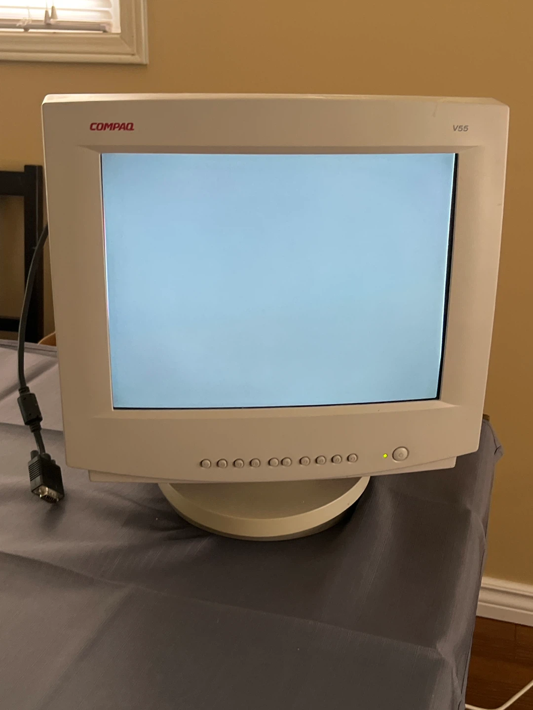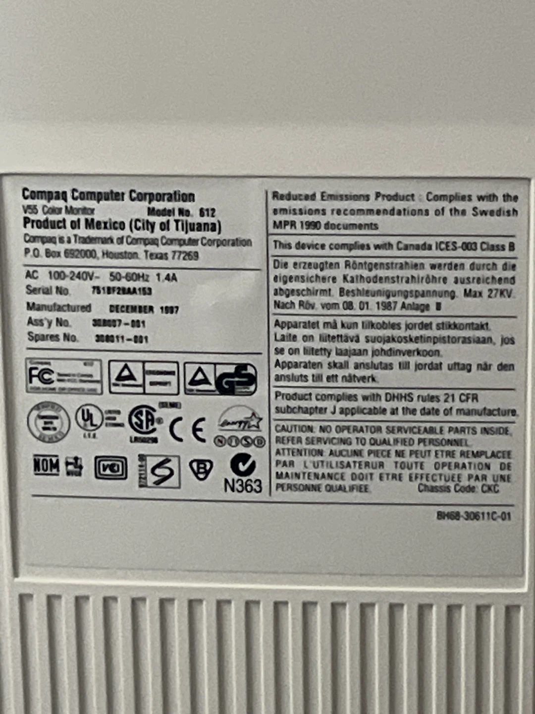 This is a Compaq V55 Color Monitor, manufactured in December 1997. It runs on AC 100-240V, 50-60Hz, 1.4A. This monitor complies with MPR II 1990 documents and is built for reduced emissions.