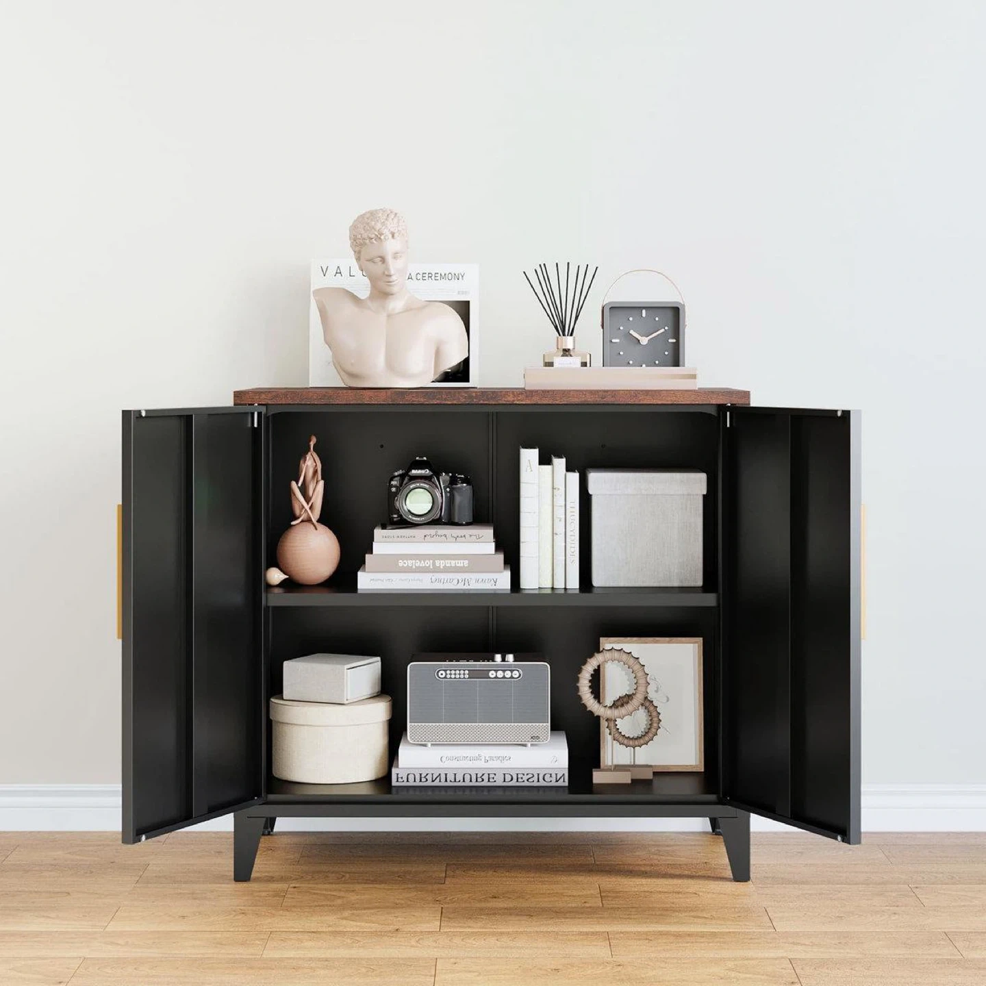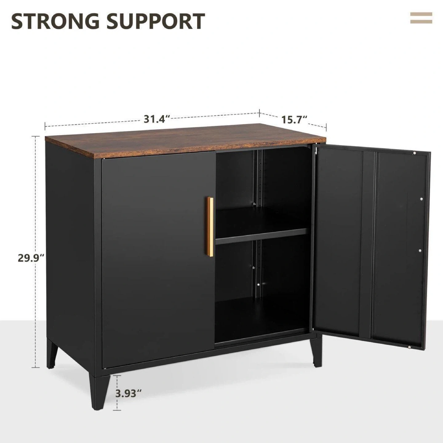 This black storage cabinet has a rustic wood top and sleek metal doors. It features two adjustable interior shelves for ample storage space. The cabinet's dimensions are 31.4" W x 15.7" D x 29.9" H. It's a great addition for organizing any room!