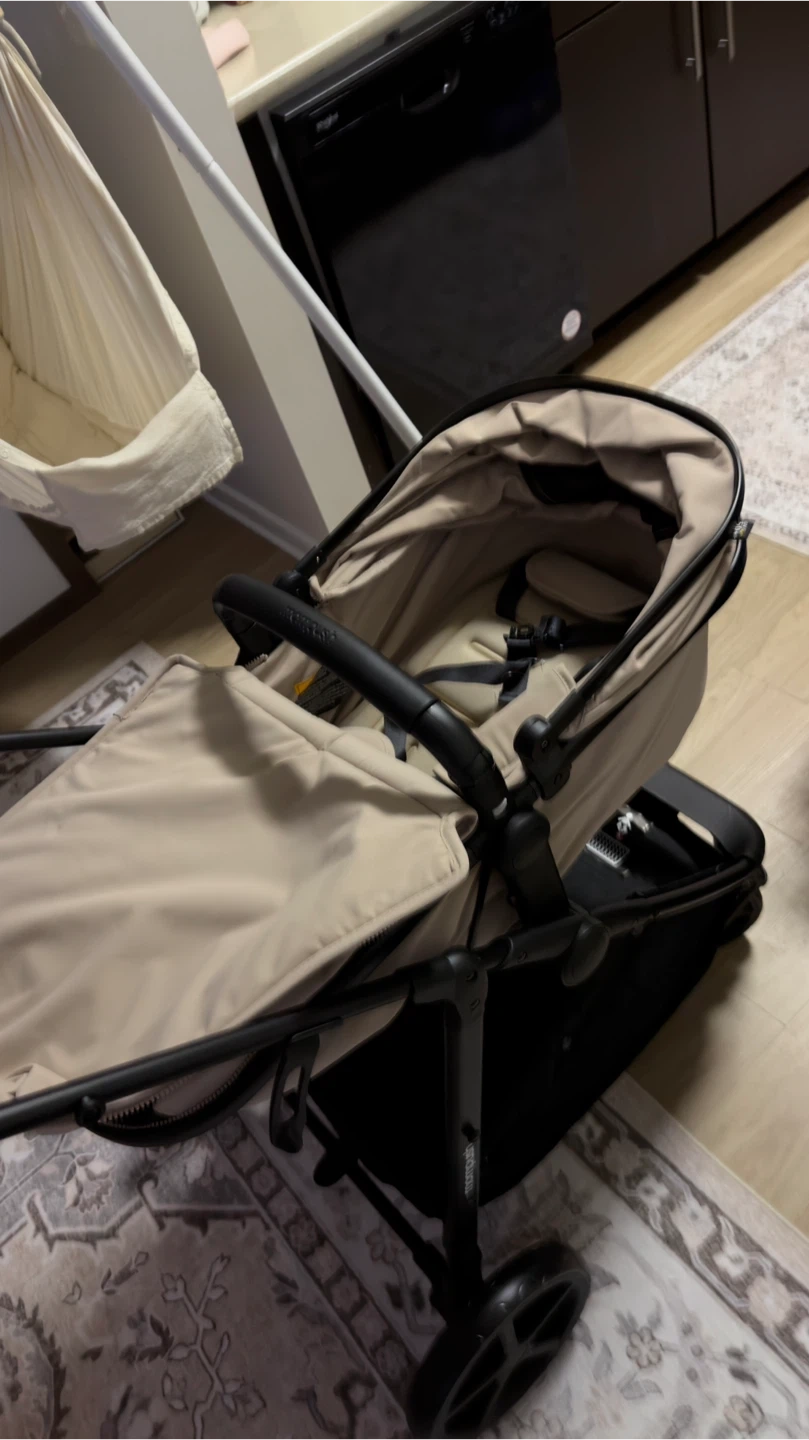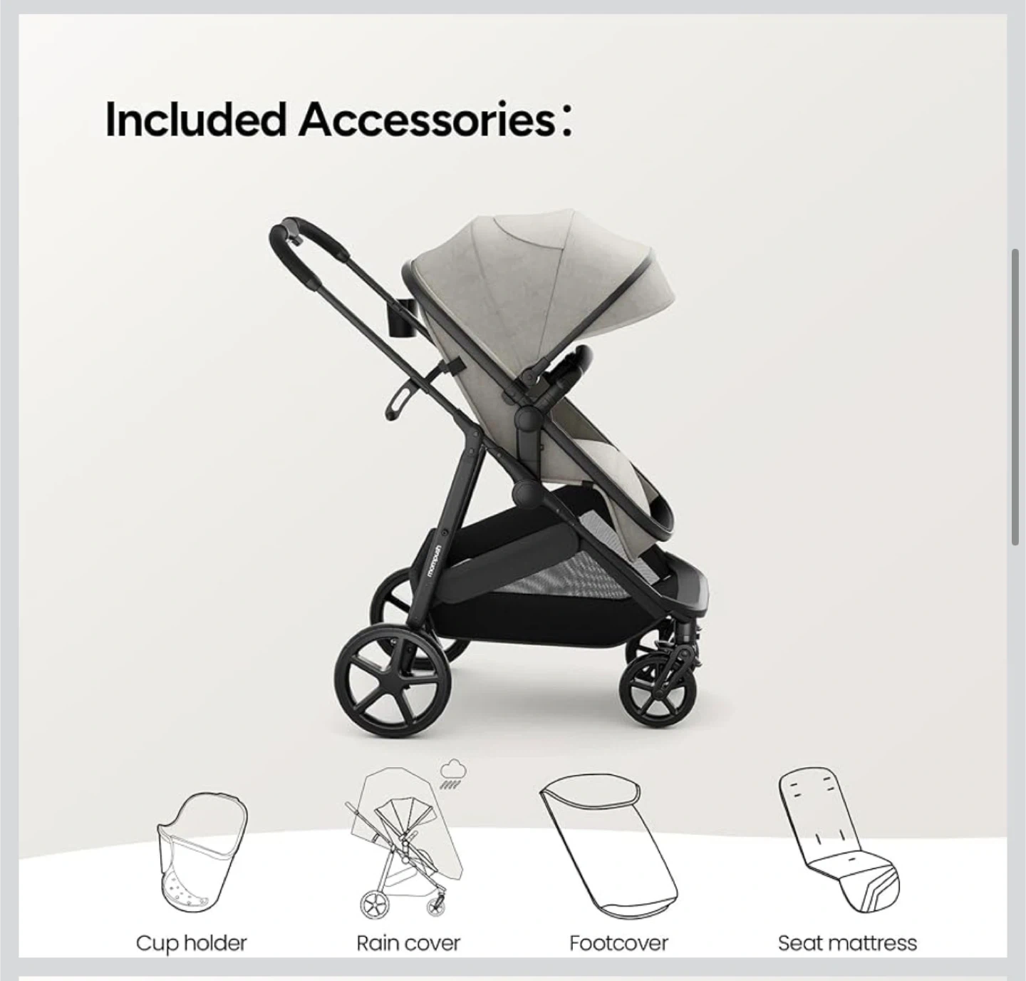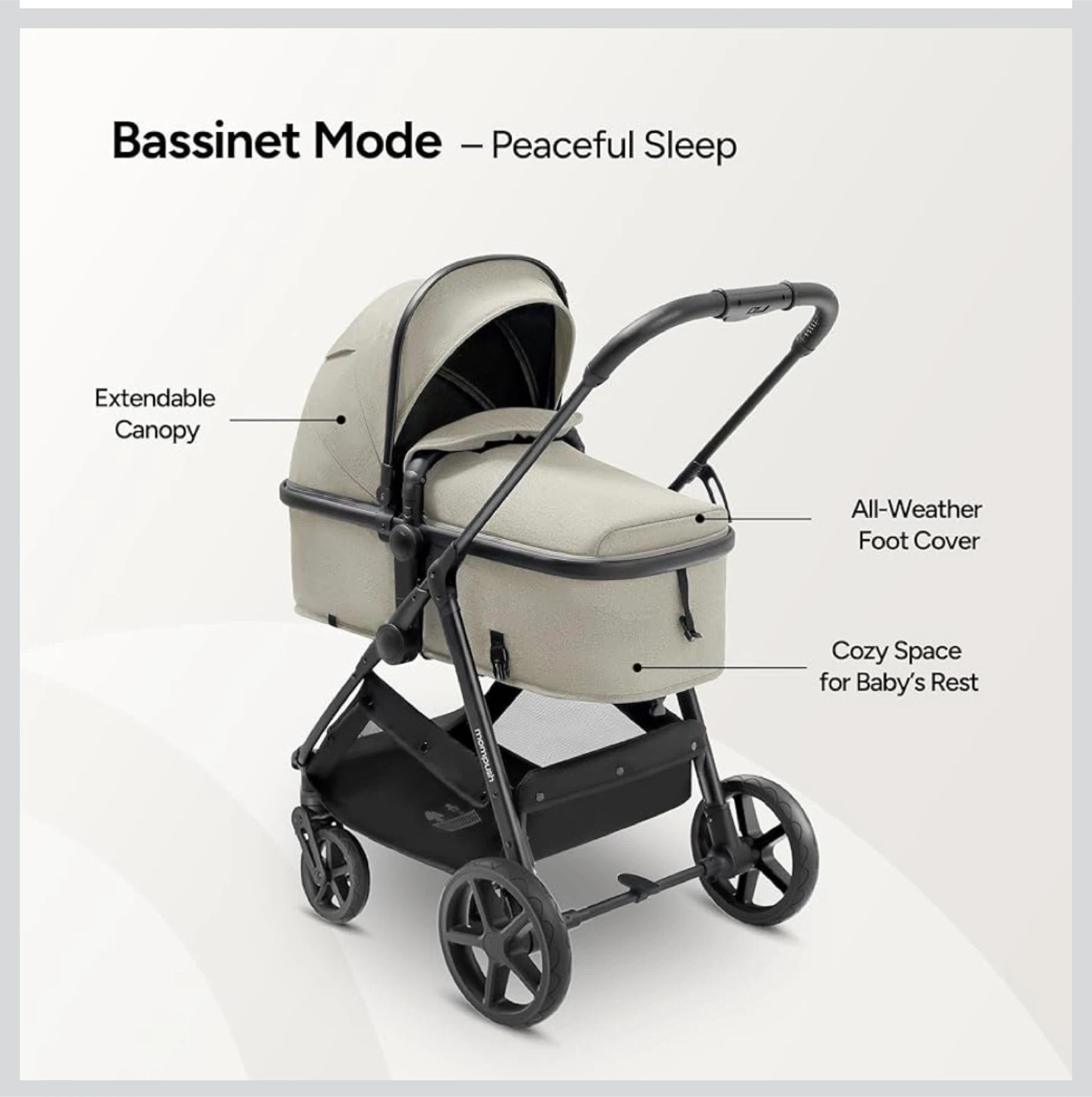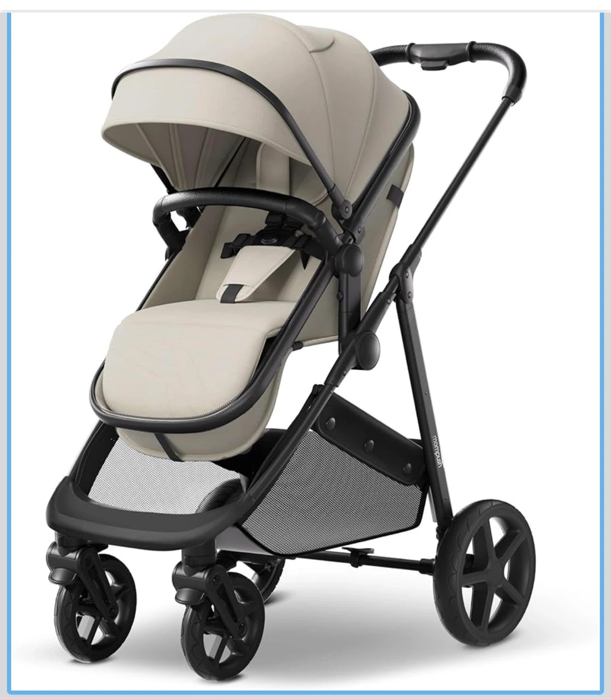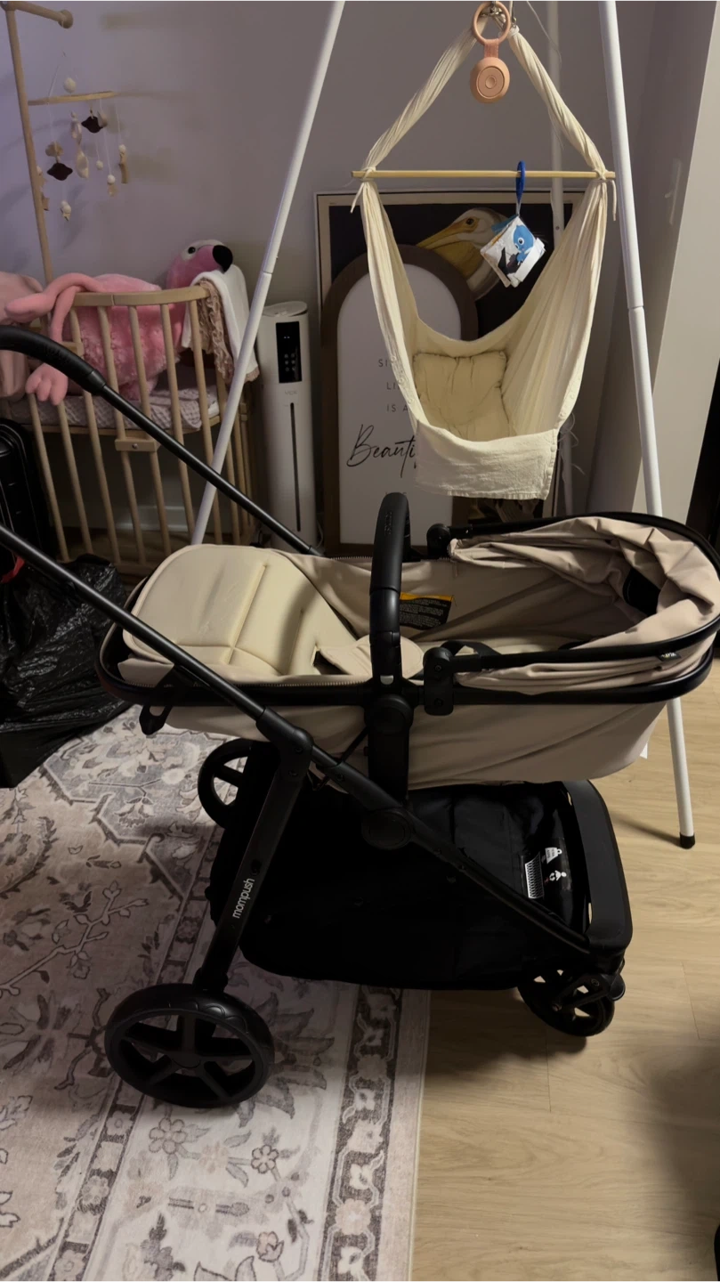 This is a Mompush stroller. It's a beige and black infant stroller with a canopy and storage basket. It folds for easy transport.