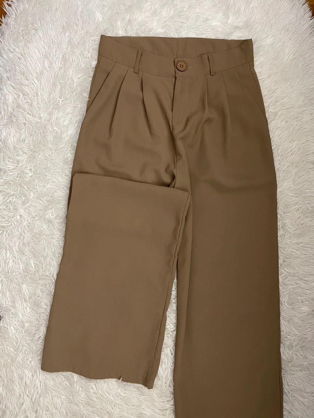 These are women's brown wide-leg trousers. They're made of a smooth, lightweight fabric. The trousers have a high waist with a single button closure and pleats at the front.