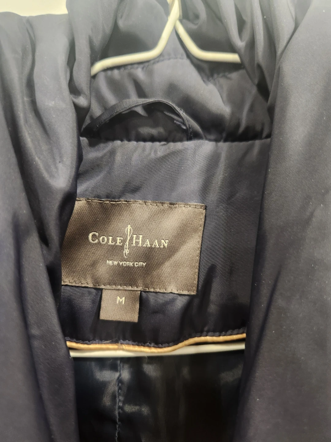 Navy blue puffer coat by Cole Haan. Features a belted waist and gold-tone zippers. Size medium. There is some damage to the stitching near the zipper, as shown in photos. Easily fixable with some sewing. Other than that it is in great condition.